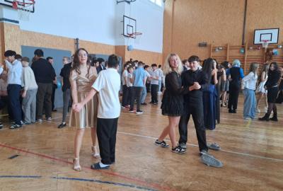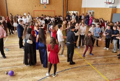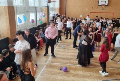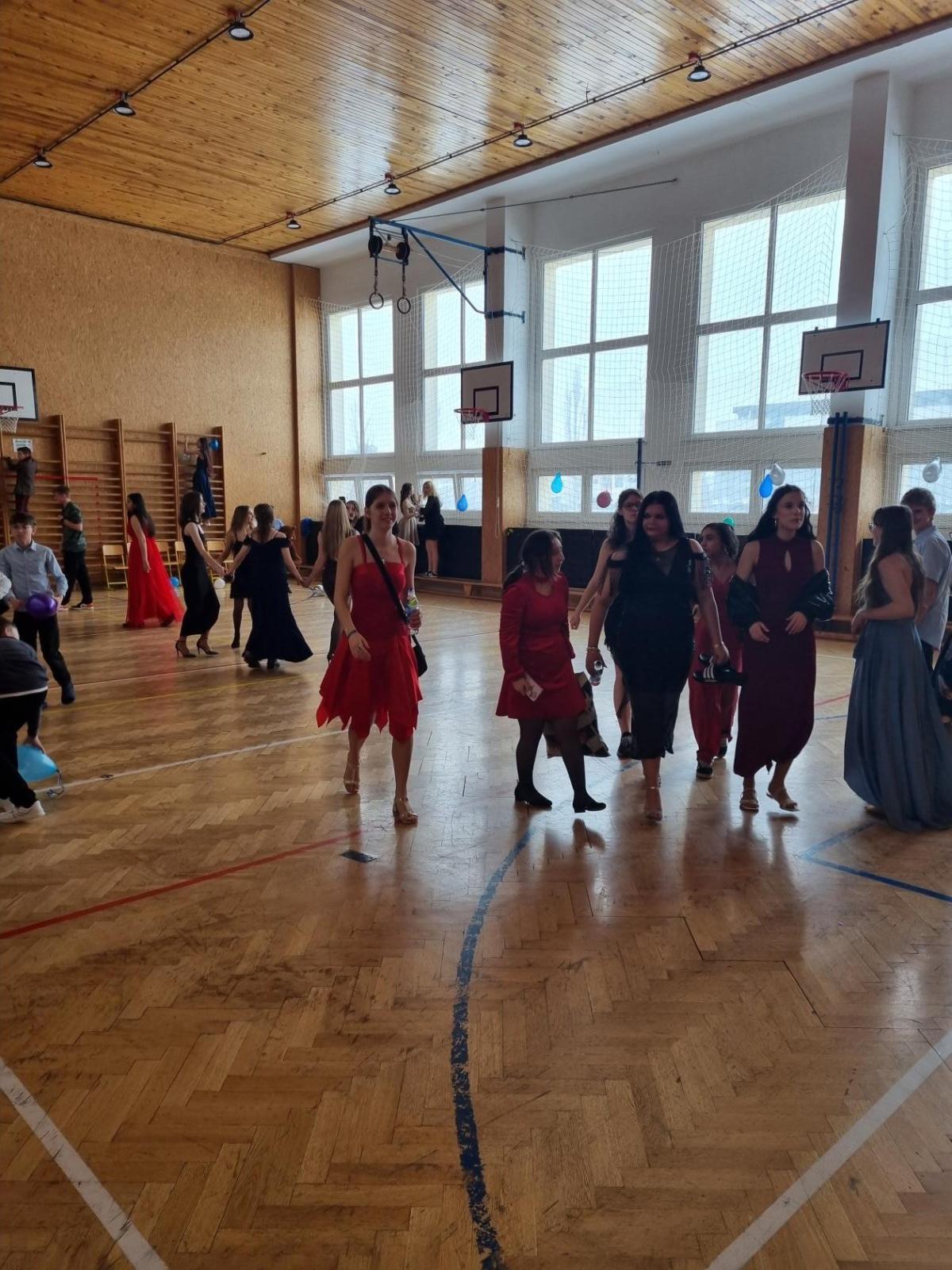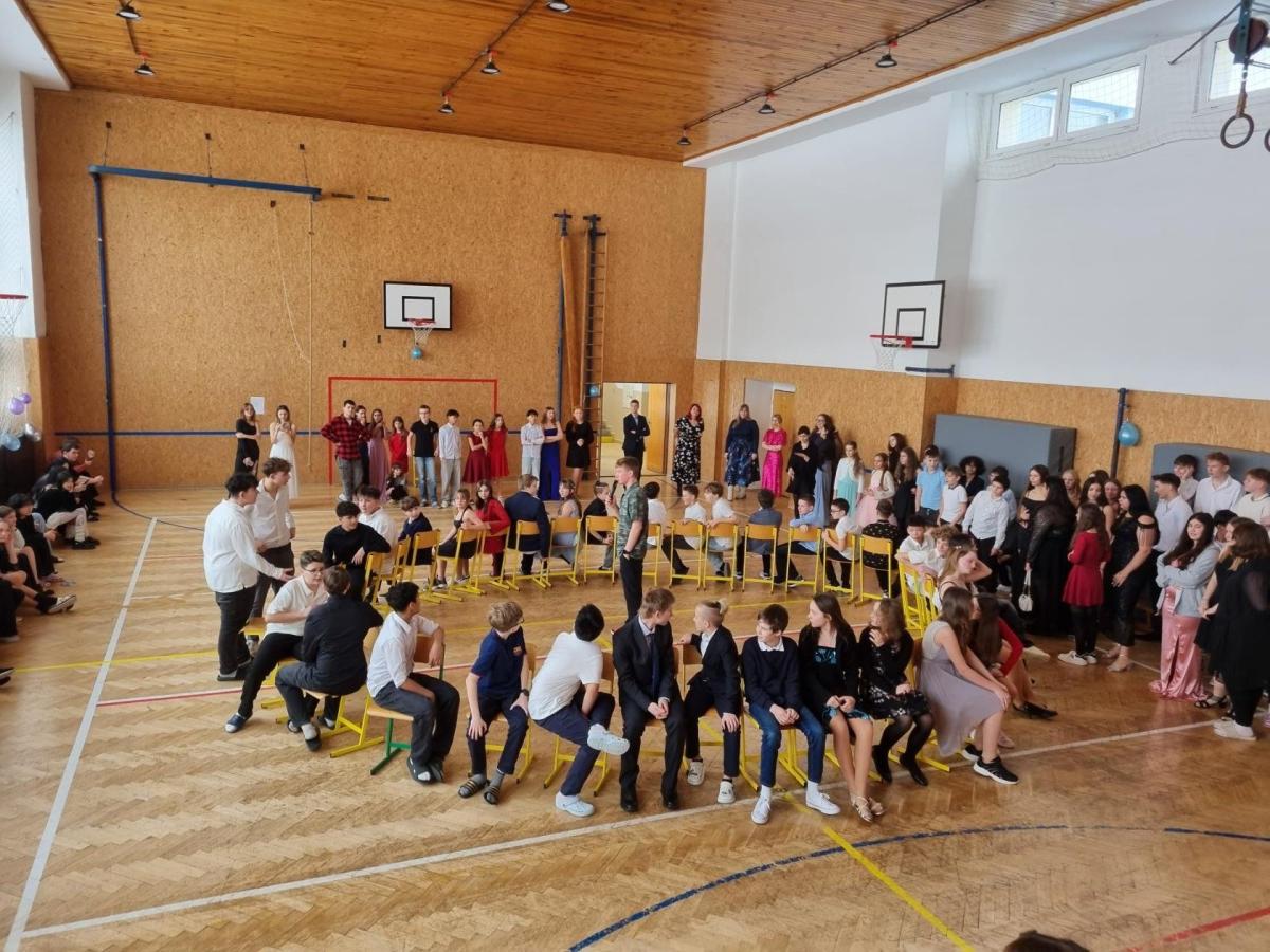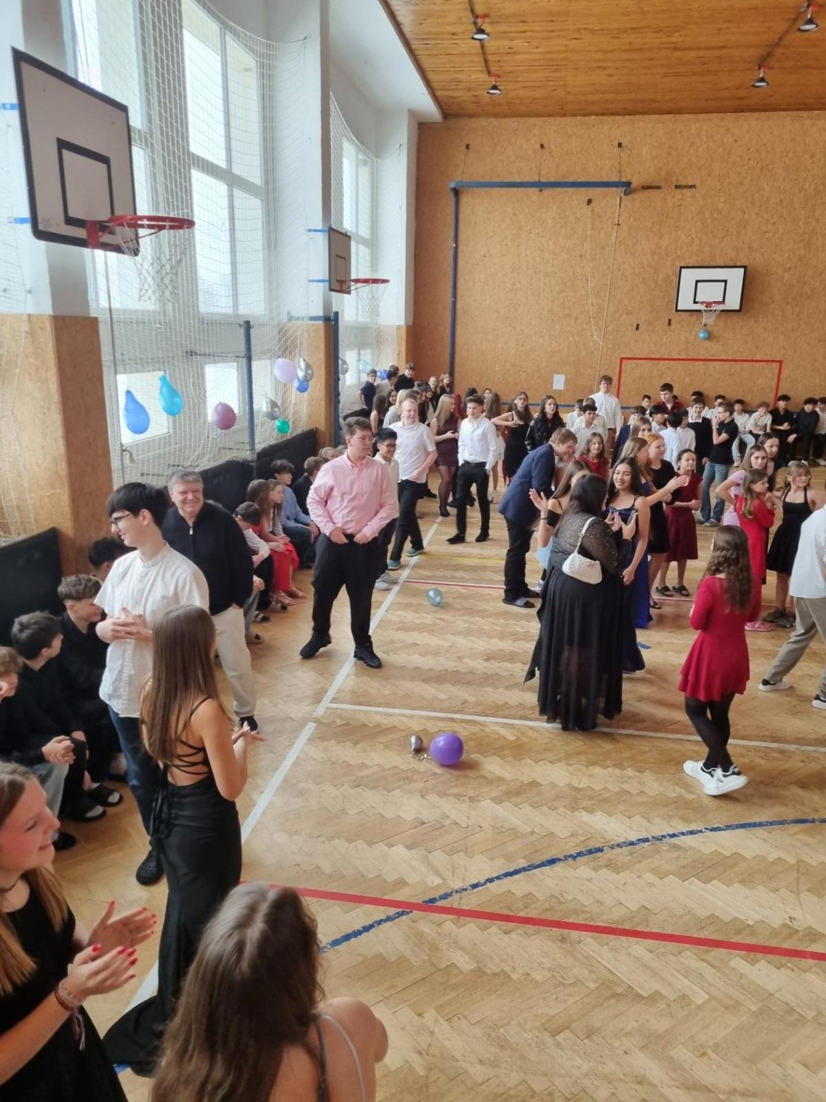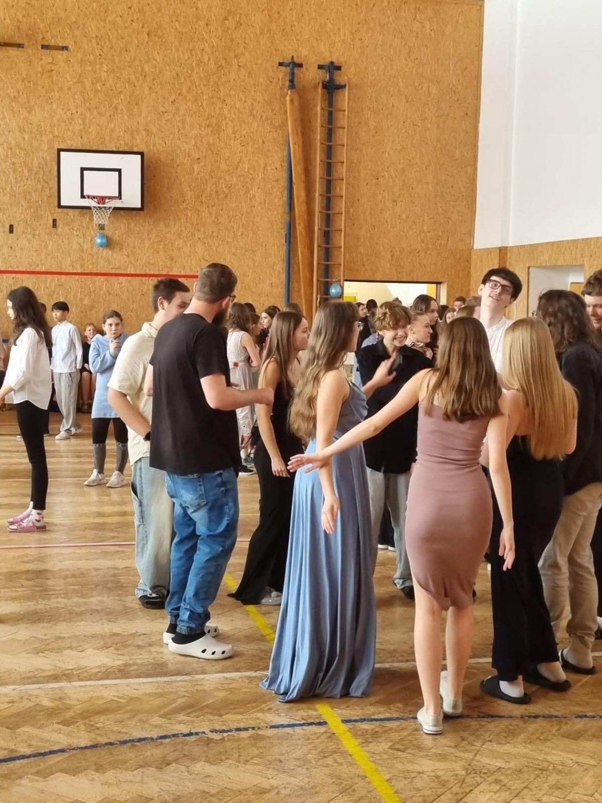 Druhý stupeň se tentokrát sešel v malé tělocvičně. Zástupci školního parlamentu v čele s paní učitelkou Radinovou připravili program, hudbu i výzdobu sálu. Ples zahájilo zajímavé předtančení šikovných žákyň z 9.B. Dále byla možnost zahrát si židličkovanou a volný program doplnilo i hádaní učitelů z jejich fotek z dětství.