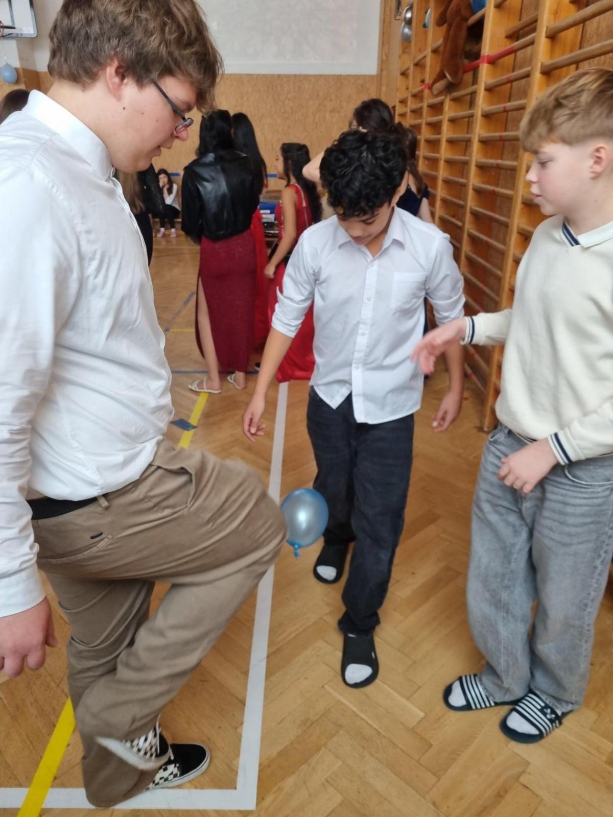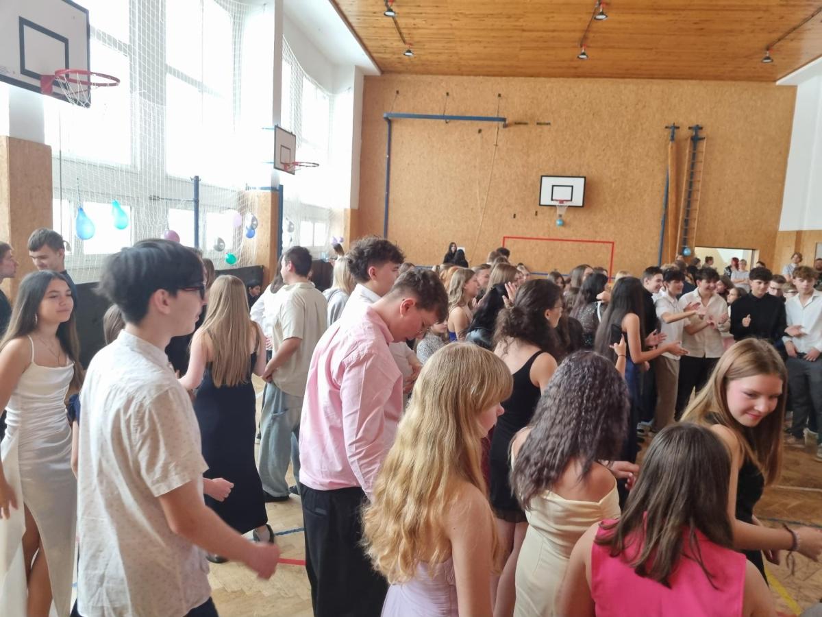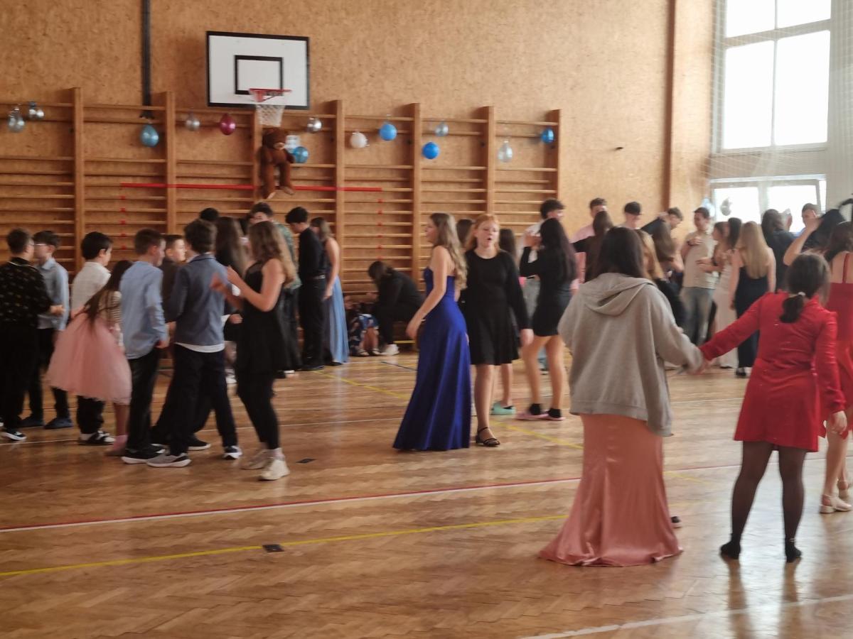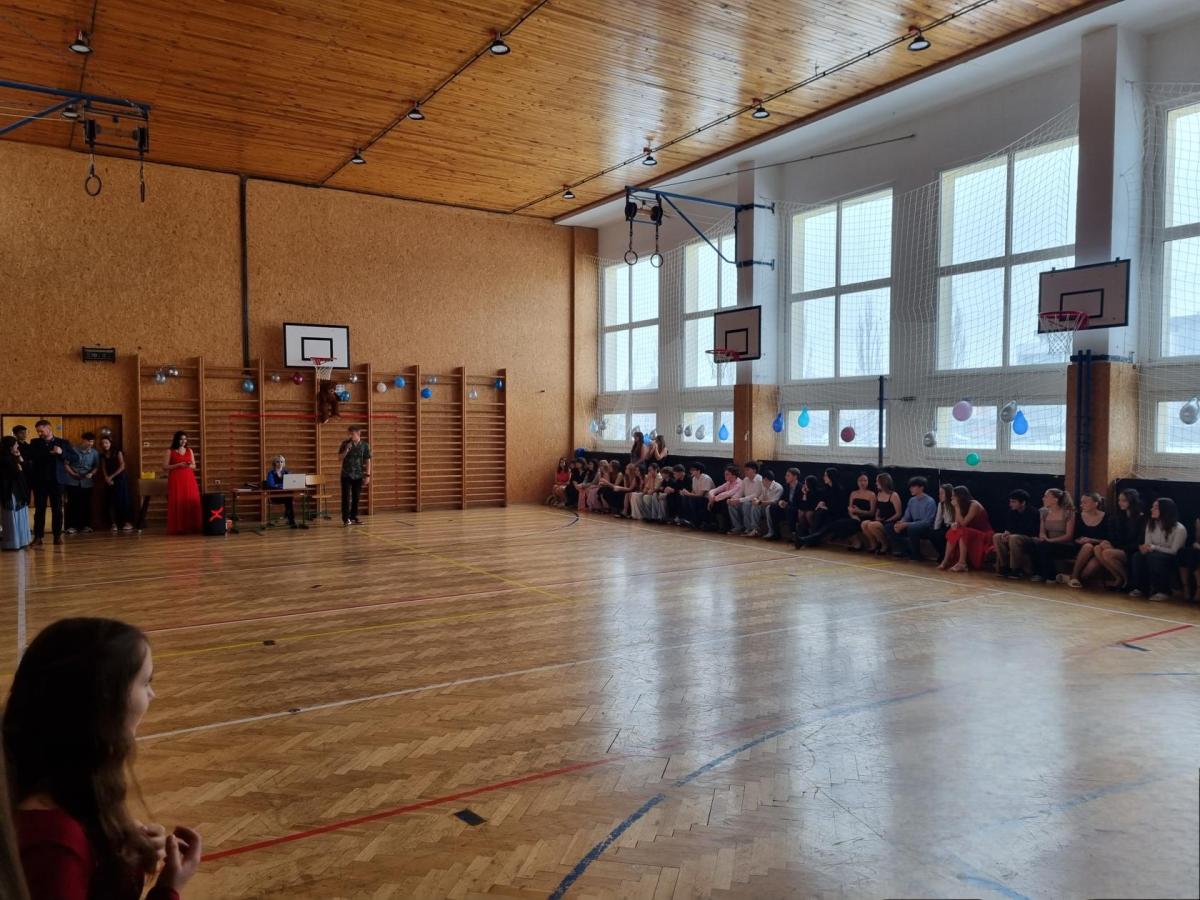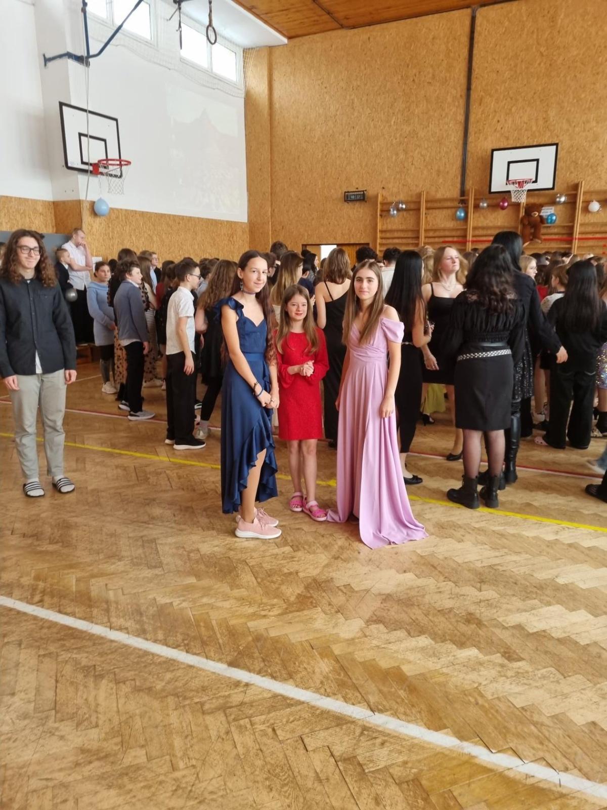 Druhý stupeň se tentokrát sešel v malé tělocvičně. Zástupci školního parlamentu v čele s paní učitelkou Radinovou připravili program, hudbu i výzdobu sálu. Ples zahájilo zajímavé předtančení šikovných žákyň z 9.B. Dále byla možnost zahrát si židličkovanou a volný program doplnilo i hádaní učitelů z jejich fotek z dětství.