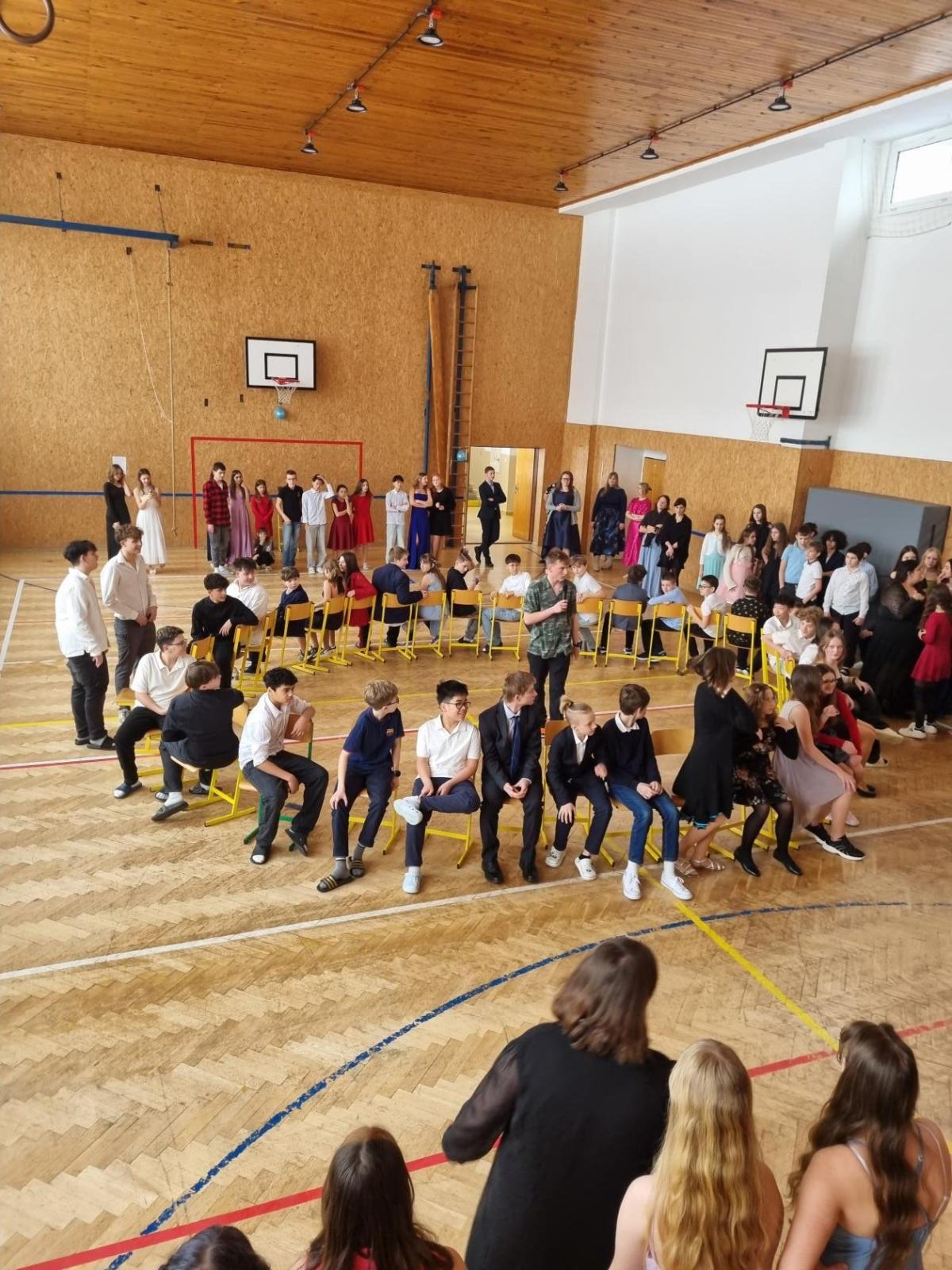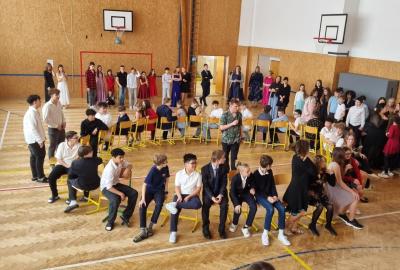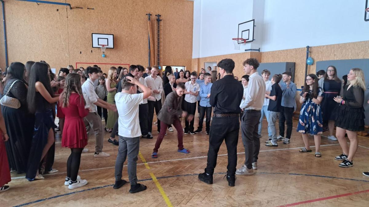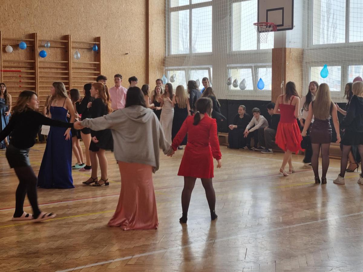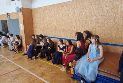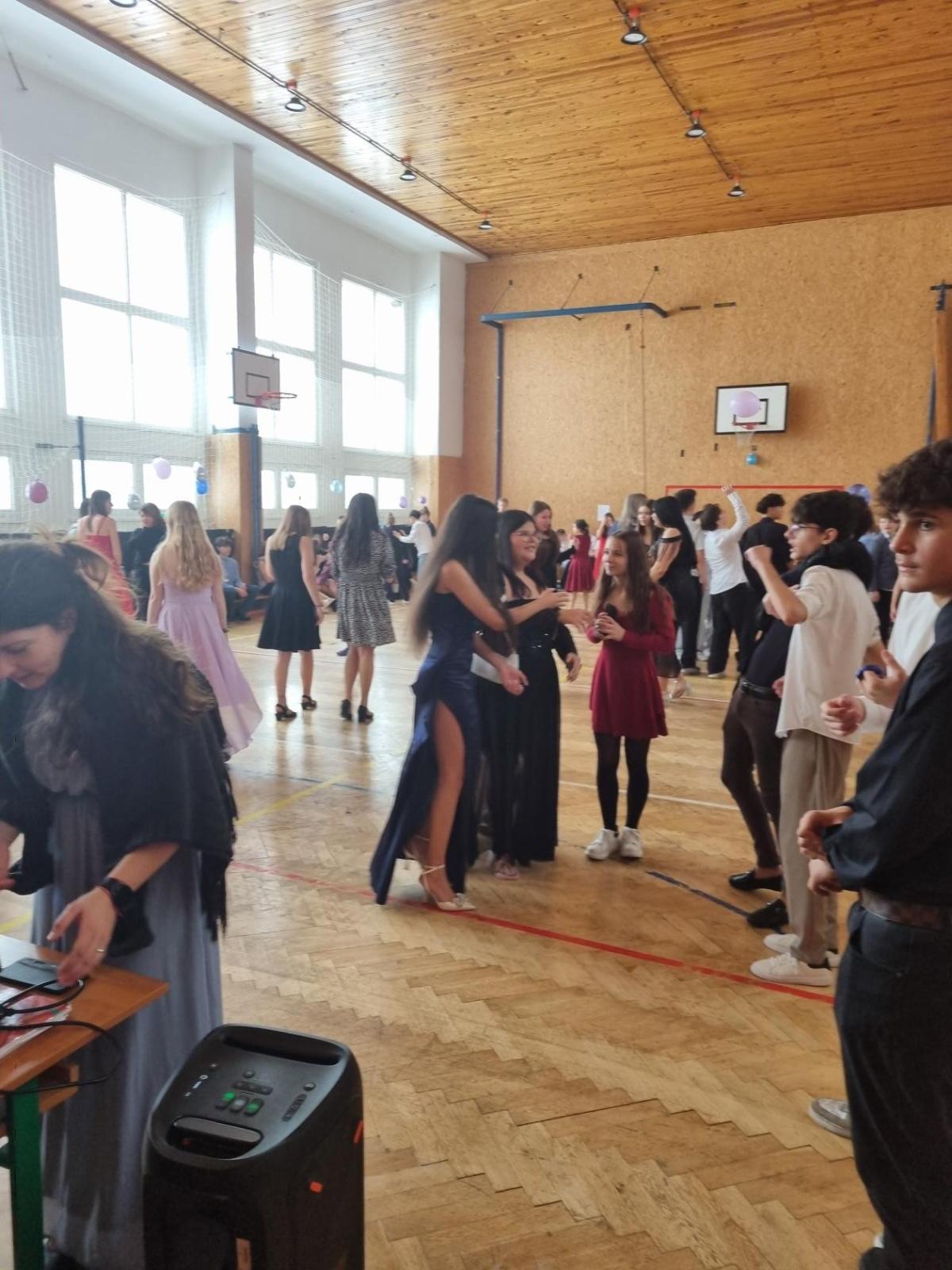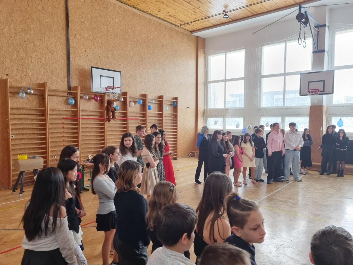 Druhý stupeň se tentokrát sešel v malé tělocvičně. Zástupci školního parlamentu v čele s paní učitelkou Radinovou připravili program, hudbu i výzdobu sálu. Ples zahájilo zajímavé předtančení šikovných žákyň z 9.B. Dále byla možnost zahrát si židličkovanou a volný program doplnilo i hádaní učitelů z jejich fotek z dětství.
