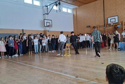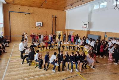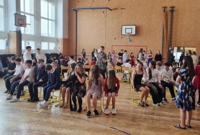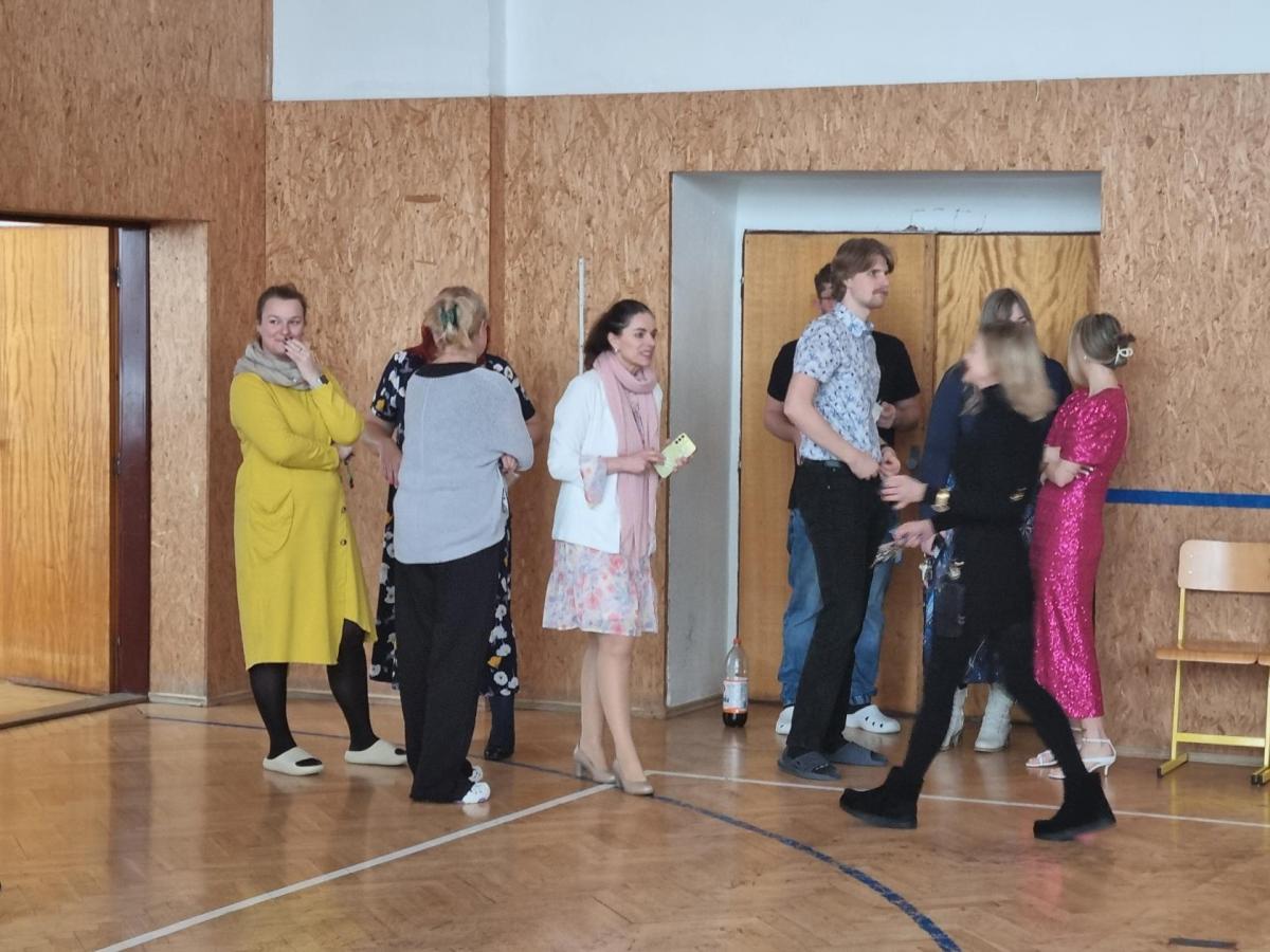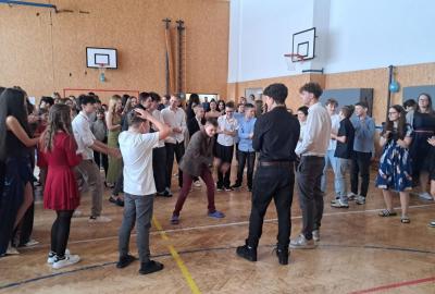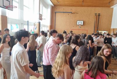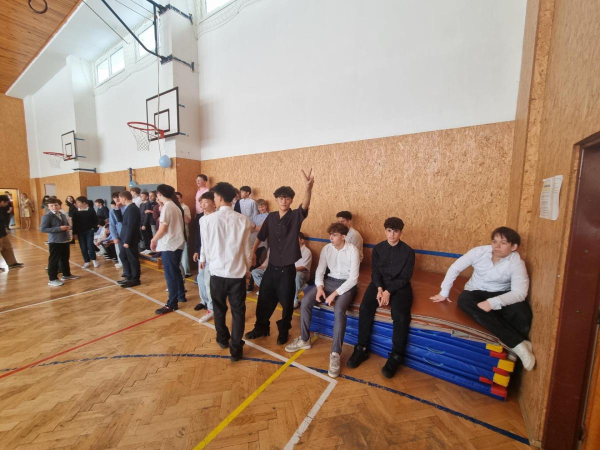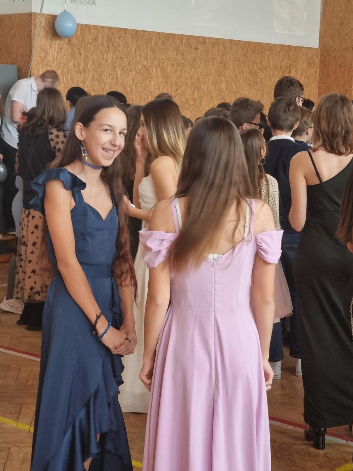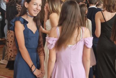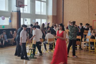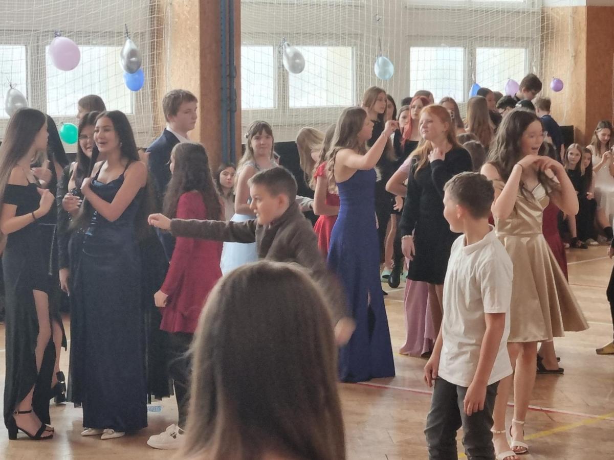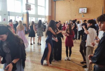 Druhý stupeň se tentokrát sešel v malé tělocvičně. Zástupci školního parlamentu v čele s paní učitelkou Radinovou připravili program, hudbu i výzdobu sálu. Ples zahájilo zajímavé předtančení šikovných žákyň z 9.B. Dále byla možnost zahrát si židličkovanou a volný program doplnilo i hádaní učitelů z jejich fotek z dětství.