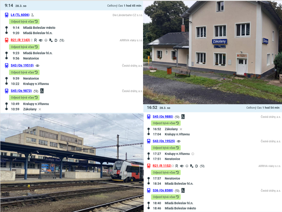 Sraz budeme mít u čekárny železniční stanice Mladá Boleslav – město (za OC Bondy) v 9.00 hod. Vlakem odjedeme v 9.14 hod z železniční stanice Mladá Boleslav – město do stanice Zákolany u Kralup nad Vltavou (příjezd 10.59 hod).