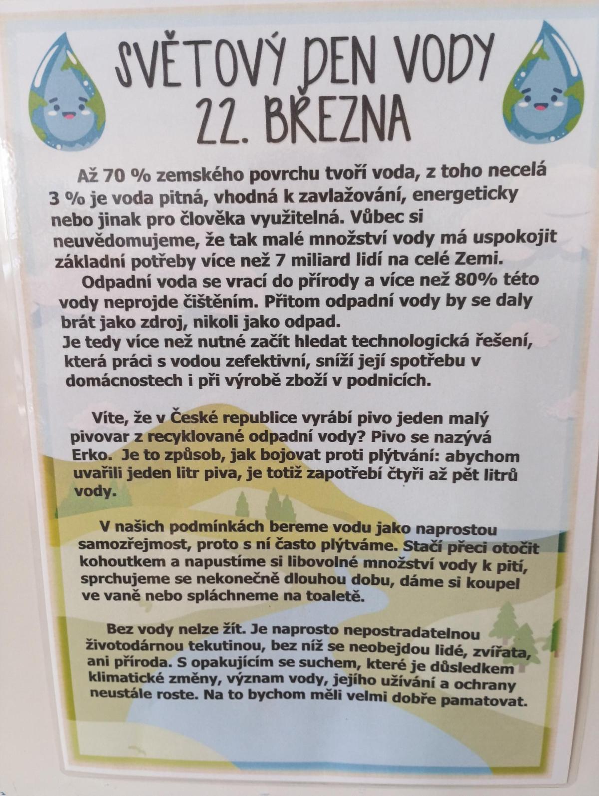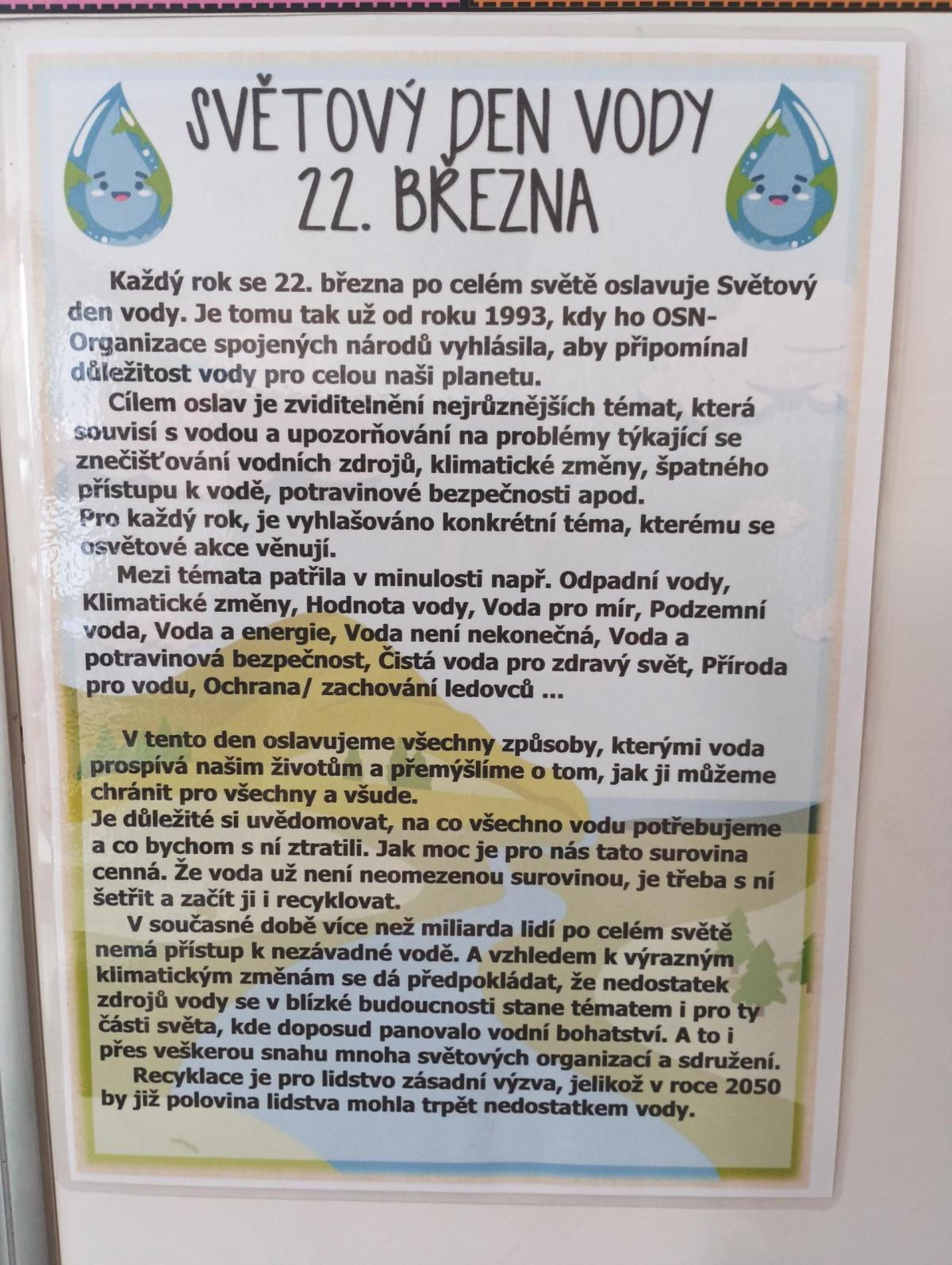Dne 22.3. je SVĚTOVÝ DEN VODY. Žáci se dozvěděli spoustu zajímavostí a plnili různé úkoly.