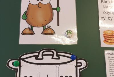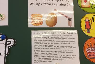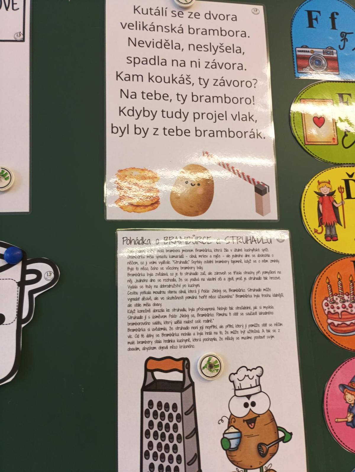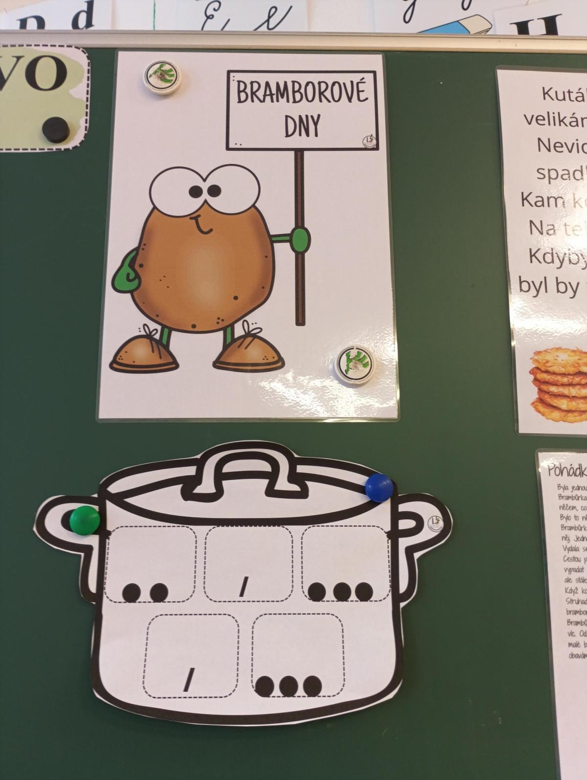 Dne 16.10. proběhl ve třídě projekt: Bramborové dny. Děti skládaly jídla z brambor, vytleskávaly slabiky a tiskaly. Každý žák dostal svůj hrnec, do kterého lepil ke správným grafickým symbolům slabik ingredience do polévky. Také si prvňáčci poslechli pohádku O Brambůrce a struhadlu.