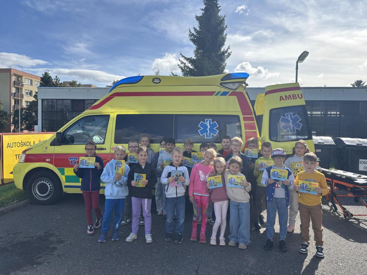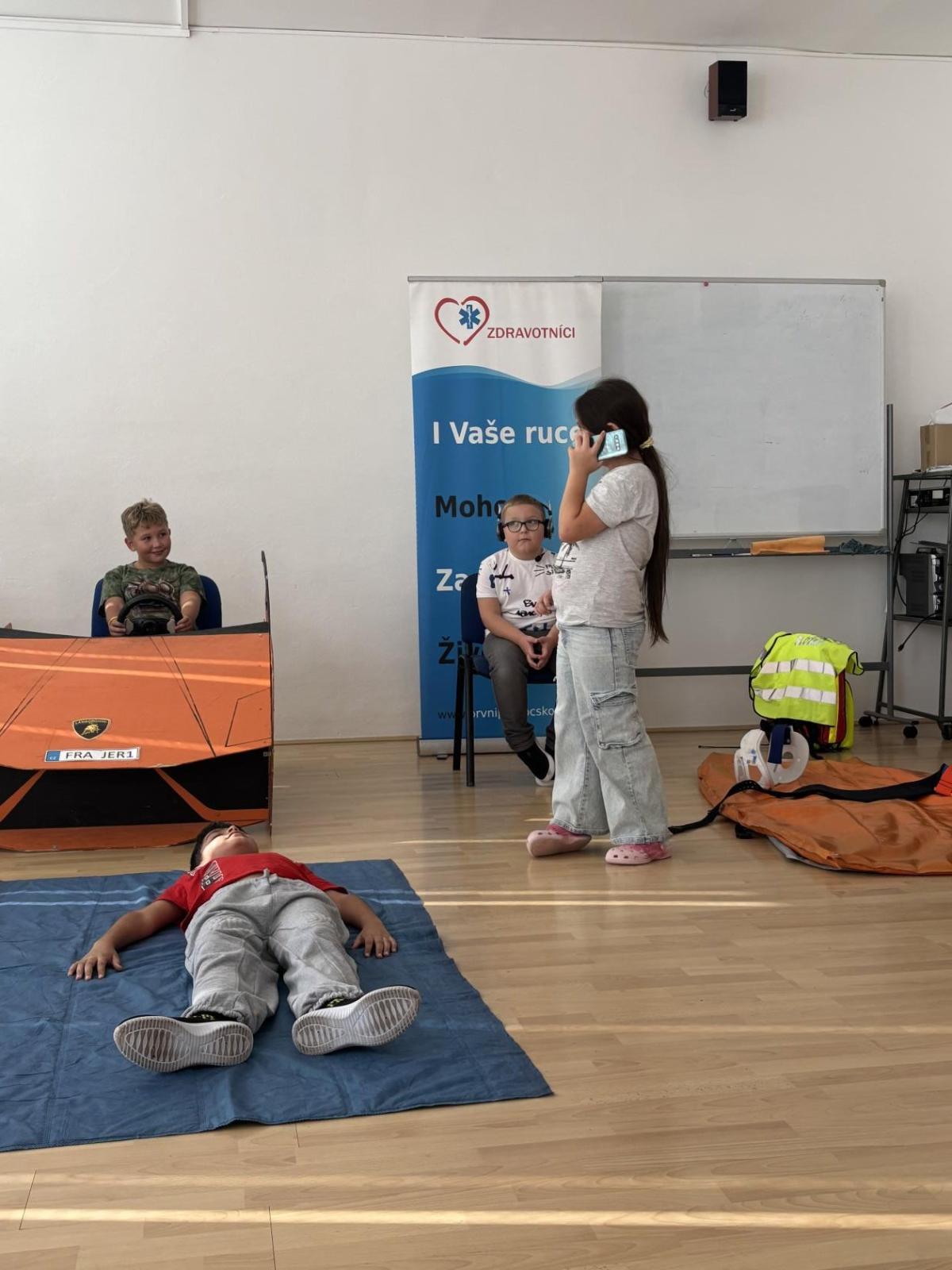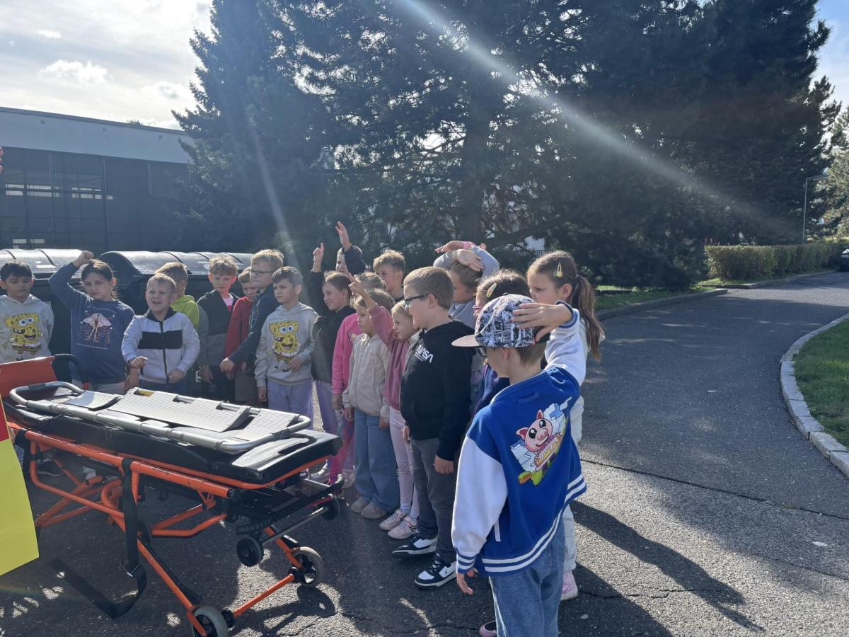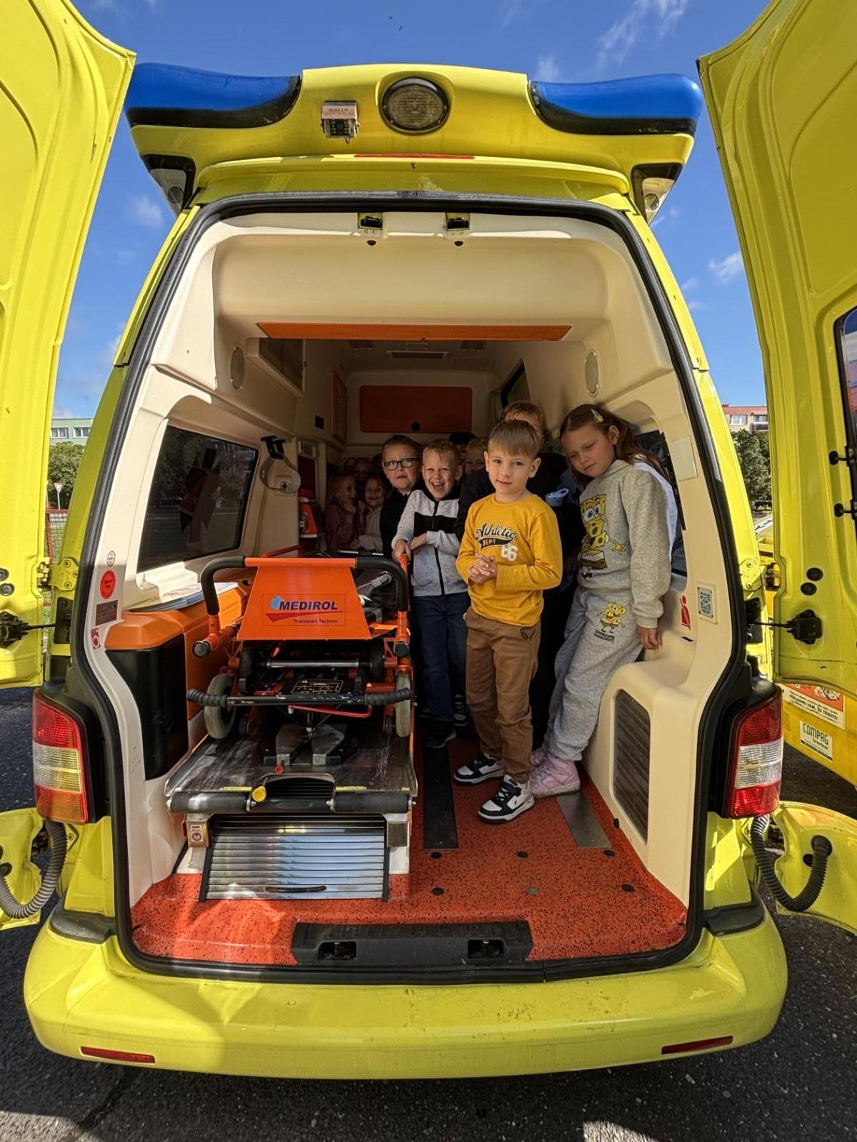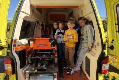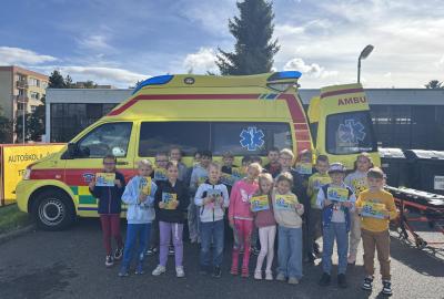 Připravili si pro nás program, při kterém jsme se učili poznat situace ohrožující život, ošetřit drobná zranění, provést resuscitaci a zavolat pomoc. Mohli jsme si také prohlédnout vozidlo záchranné služby i vybavení, které záchranáři používají.