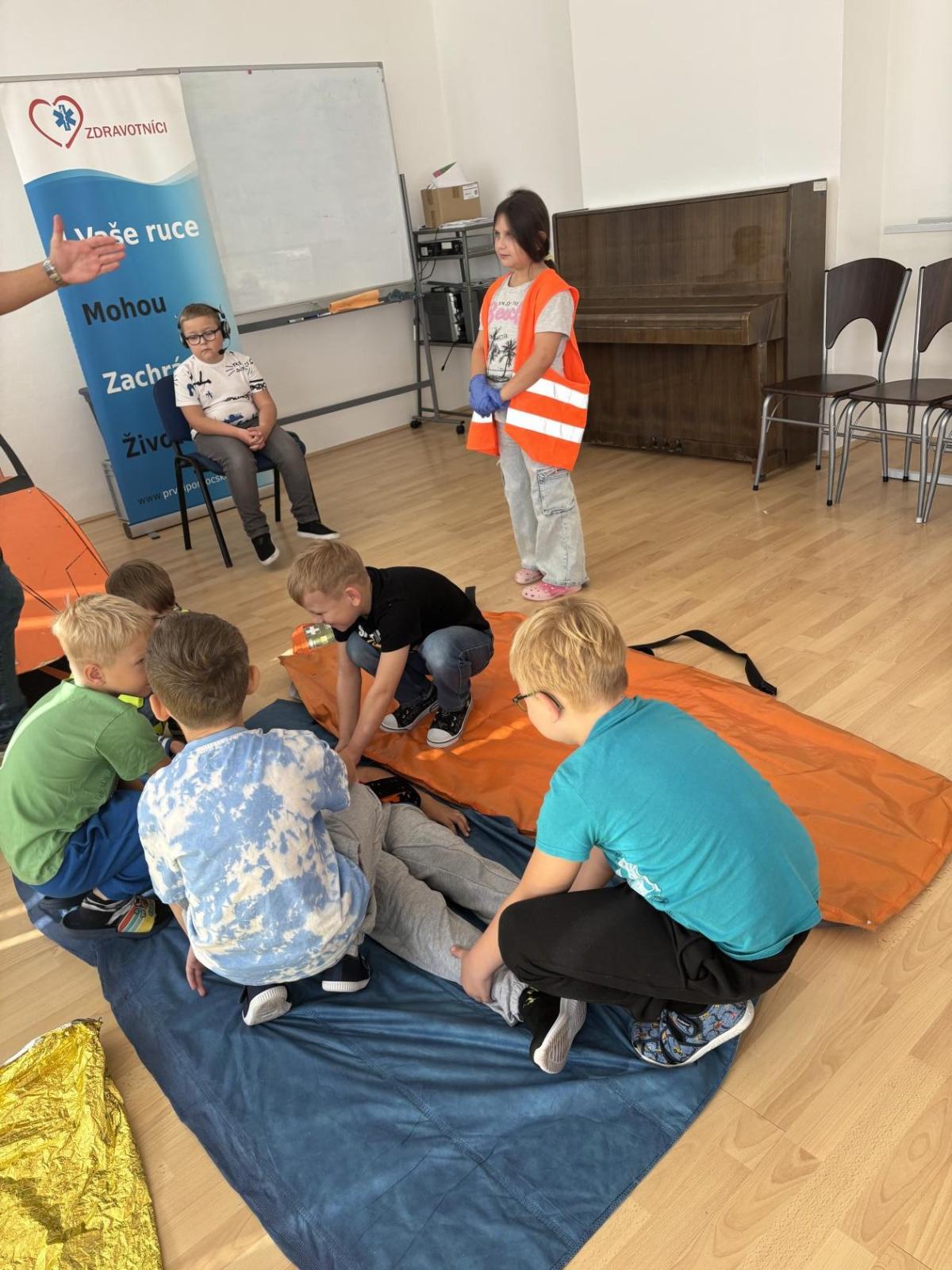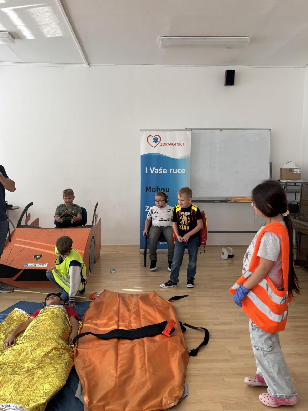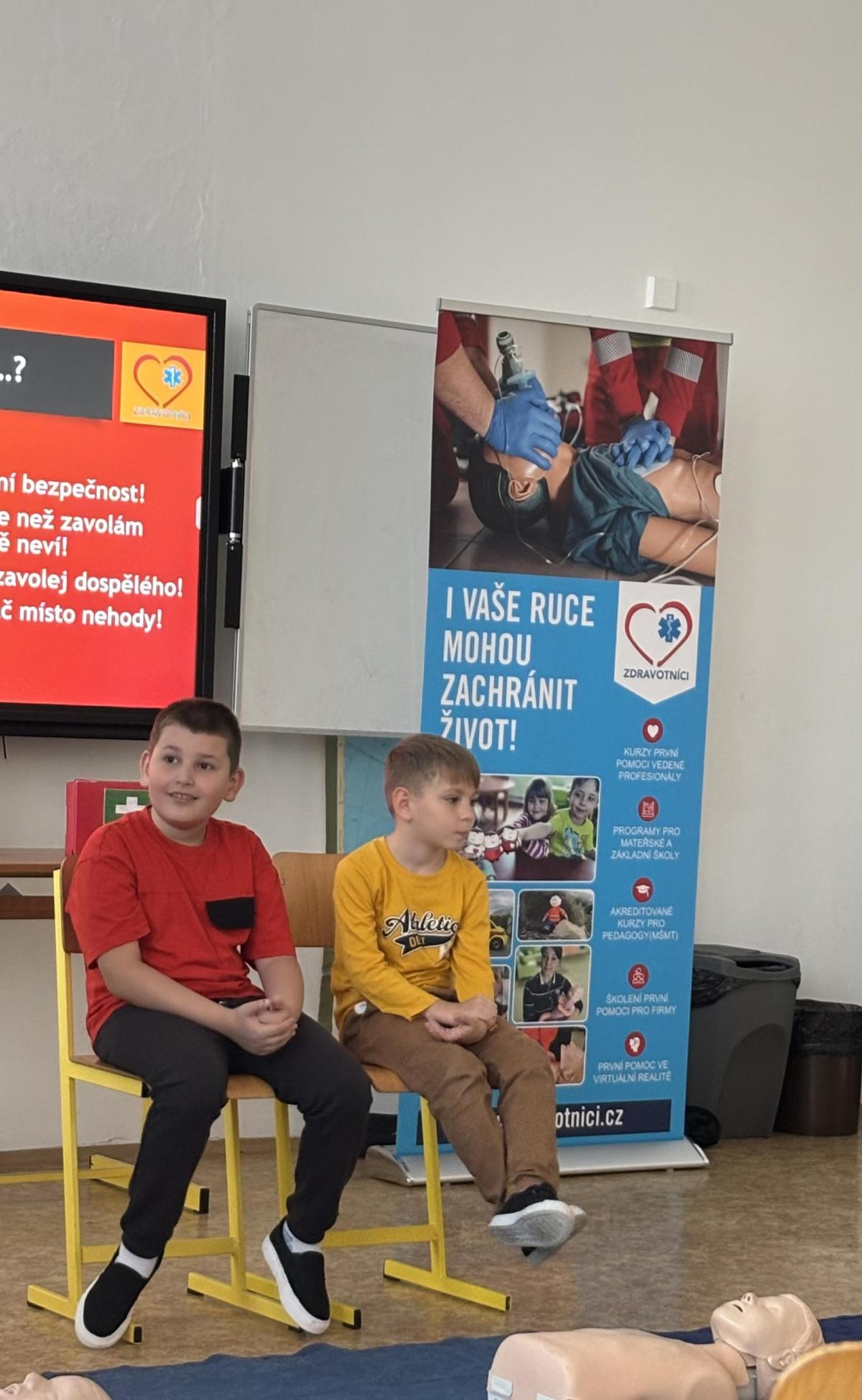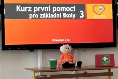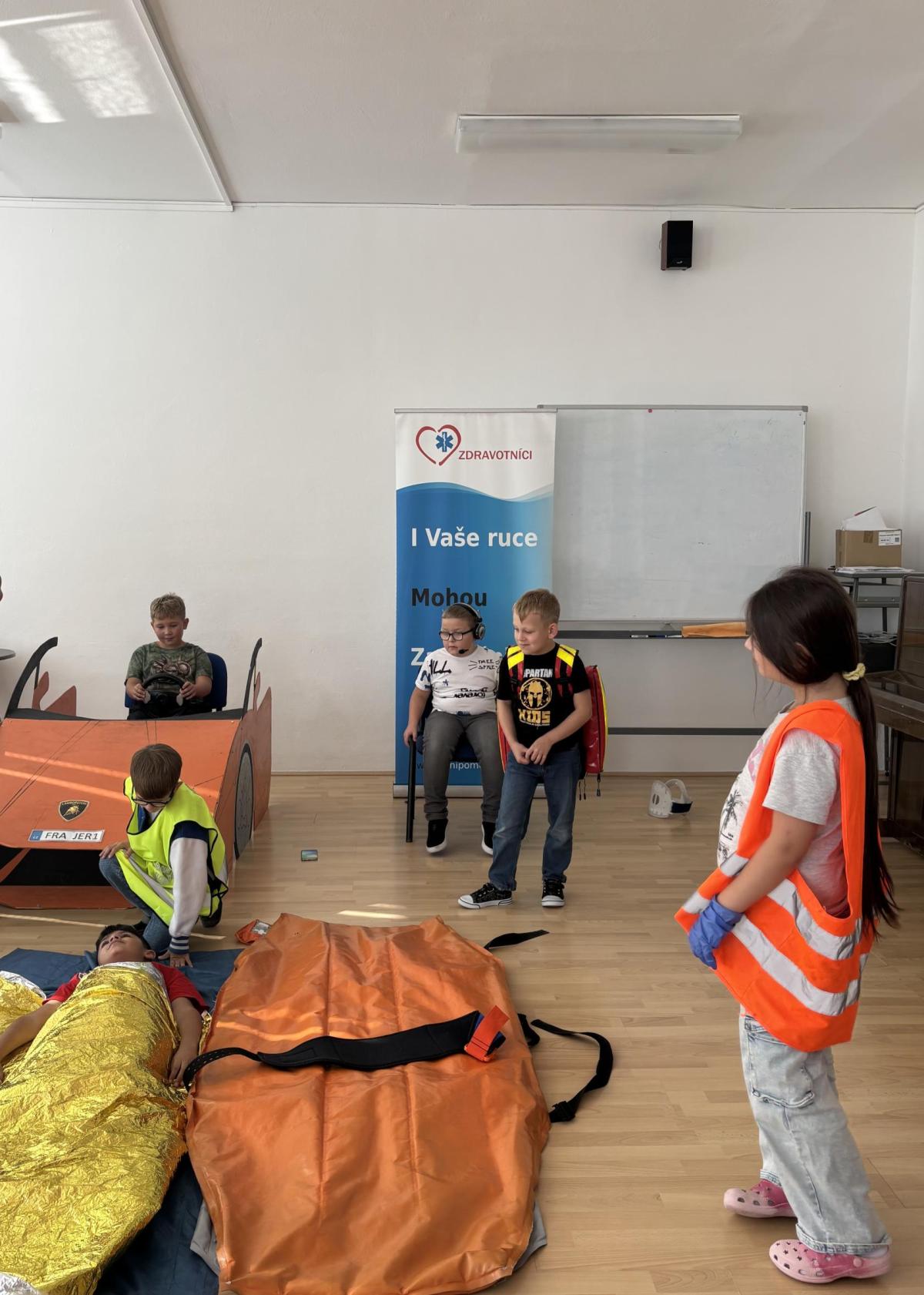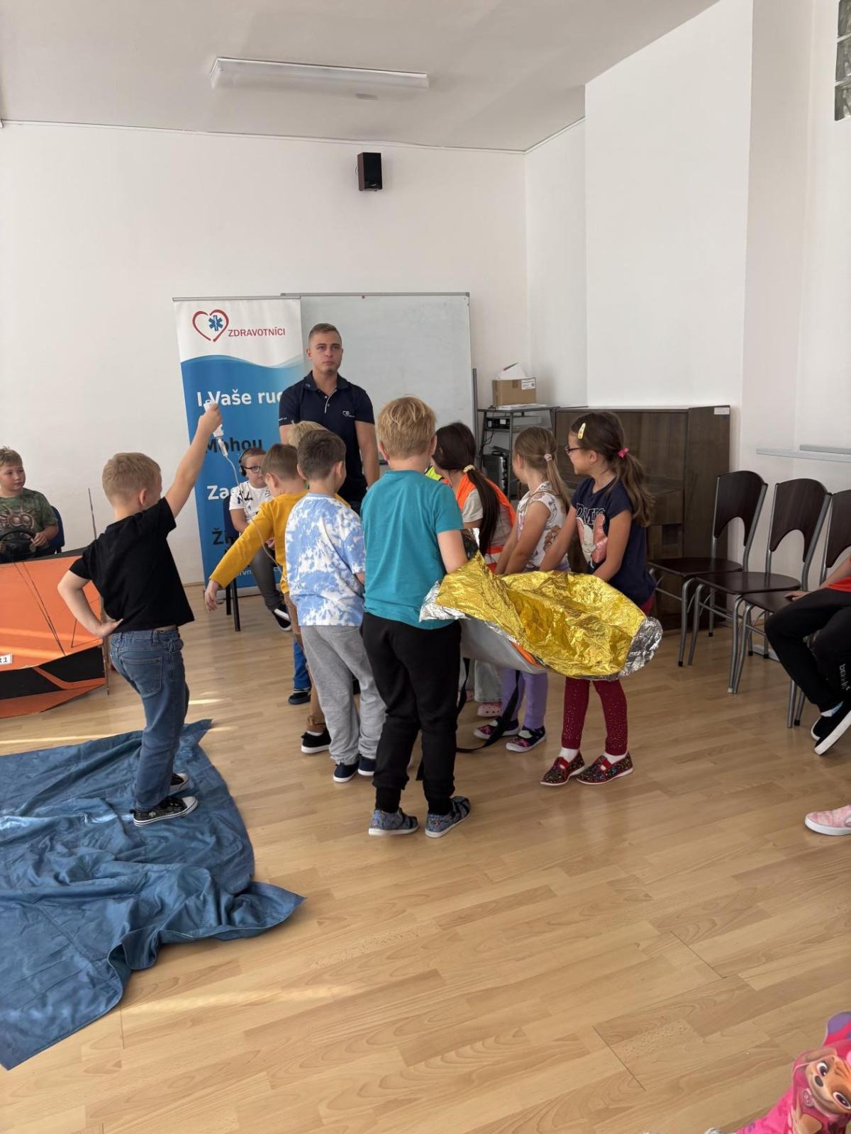 Připravili si pro nás program, při kterém jsme se učili poznat situace ohrožující život, ošetřit drobná zranění, provést resuscitaci a zavolat pomoc. Mohli jsme si také prohlédnout vozidlo záchranné služby i vybavení, které záchranáři používají.