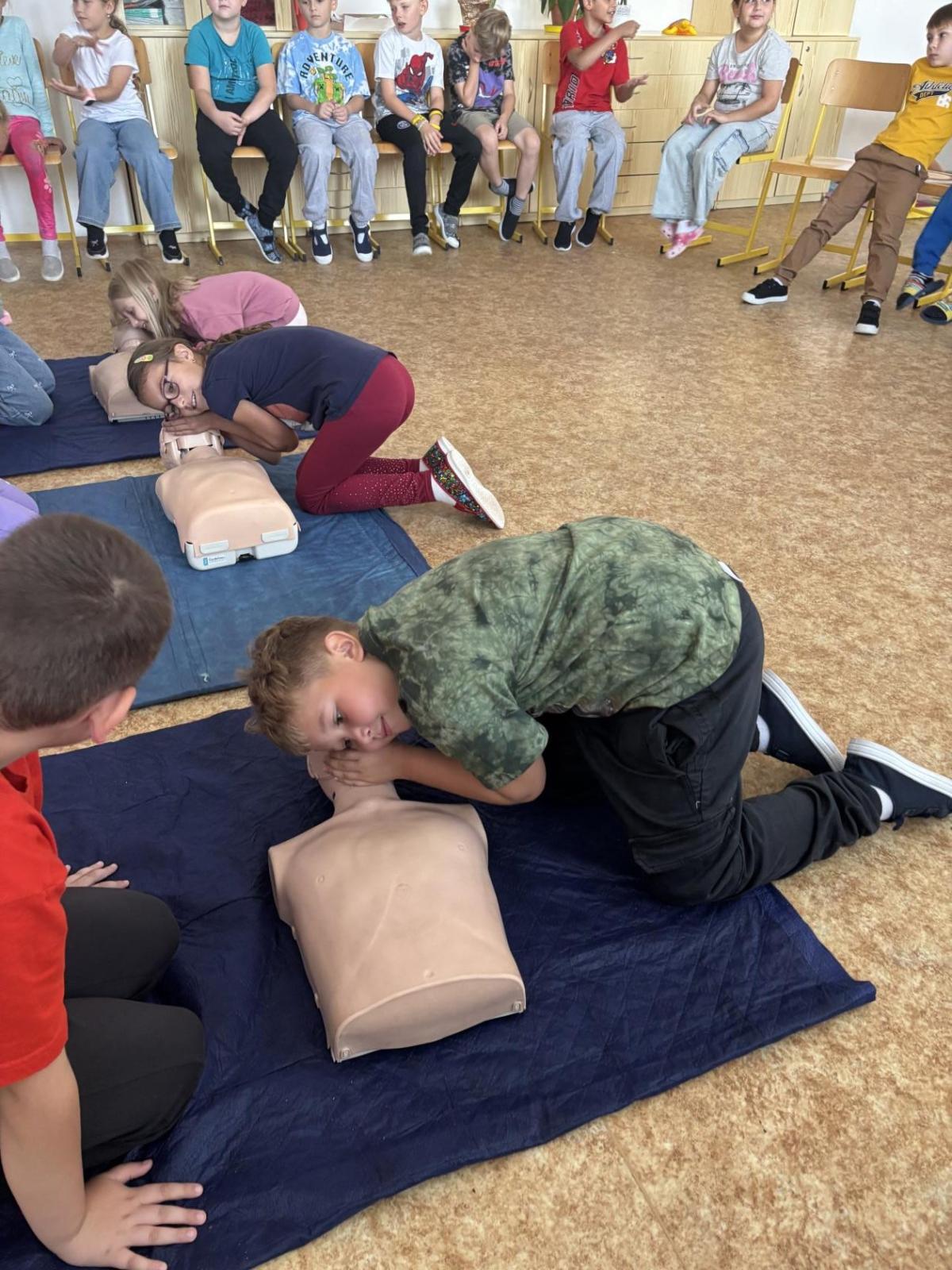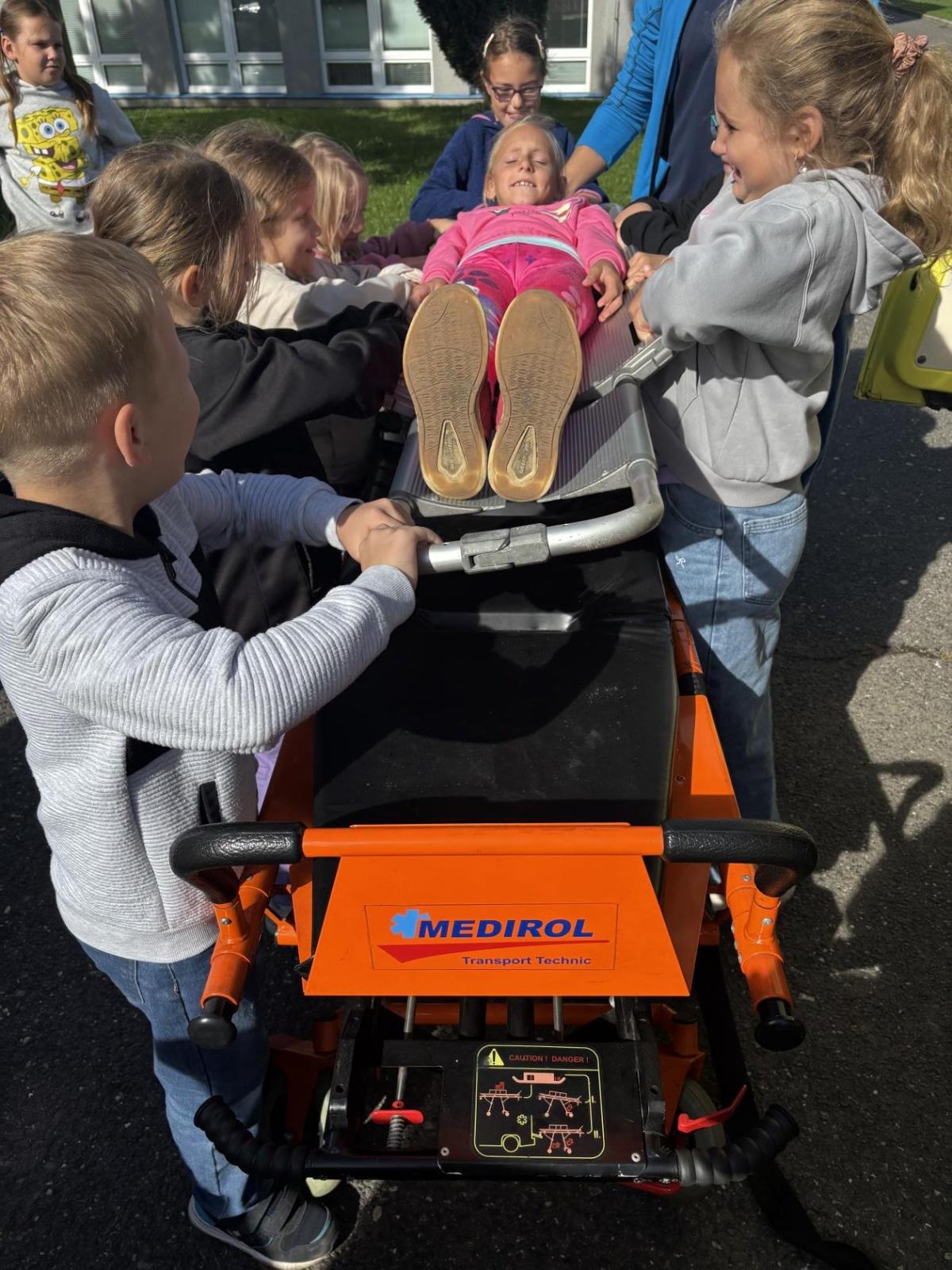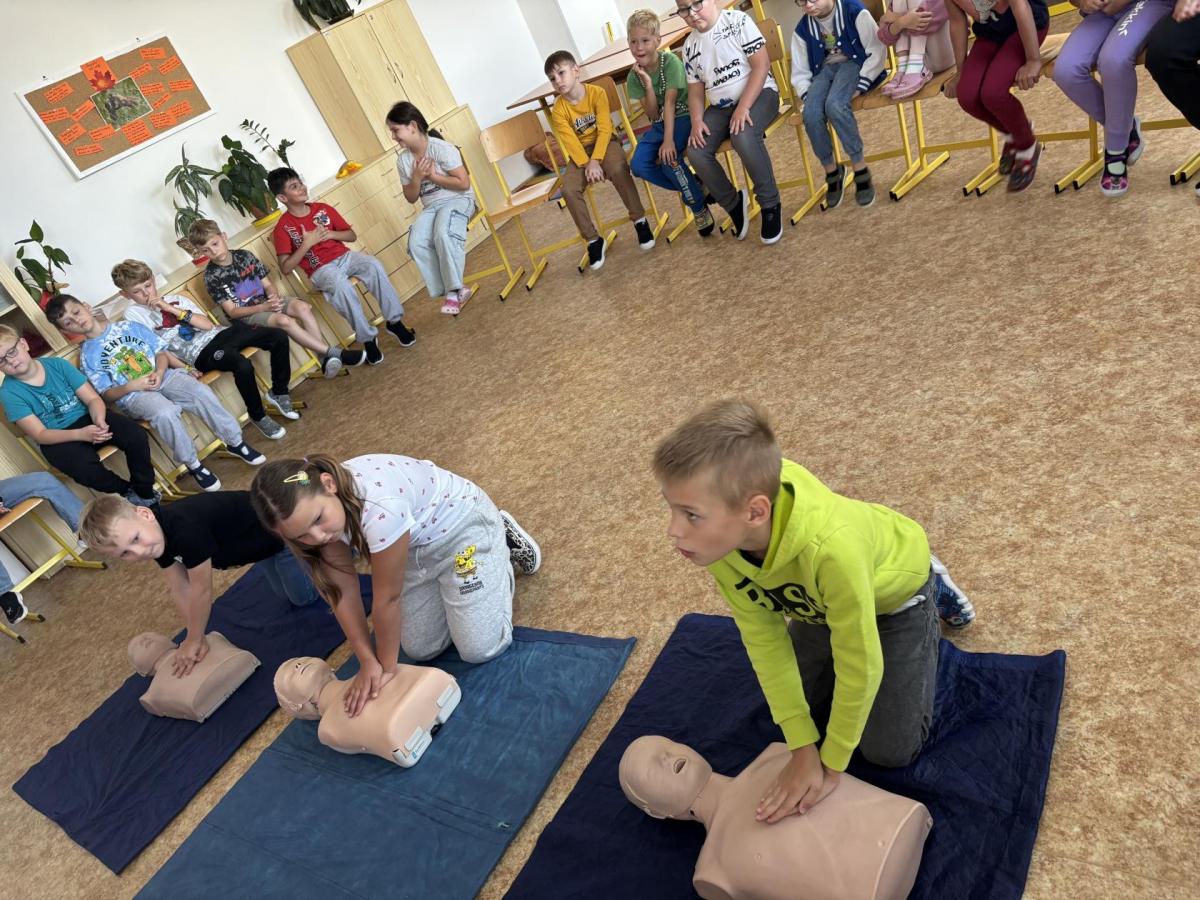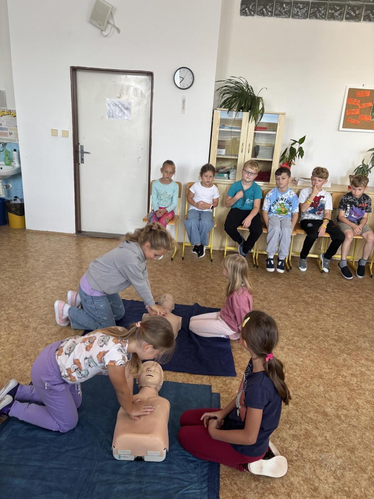 Připravili si pro nás program, při kterém jsme se učili poznat situace ohrožující život, ošetřit drobná zranění, provést resuscitaci a zavolat pomoc. Mohli jsme si také prohlédnout vozidlo záchranné služby i vybavení, které záchranáři používají.