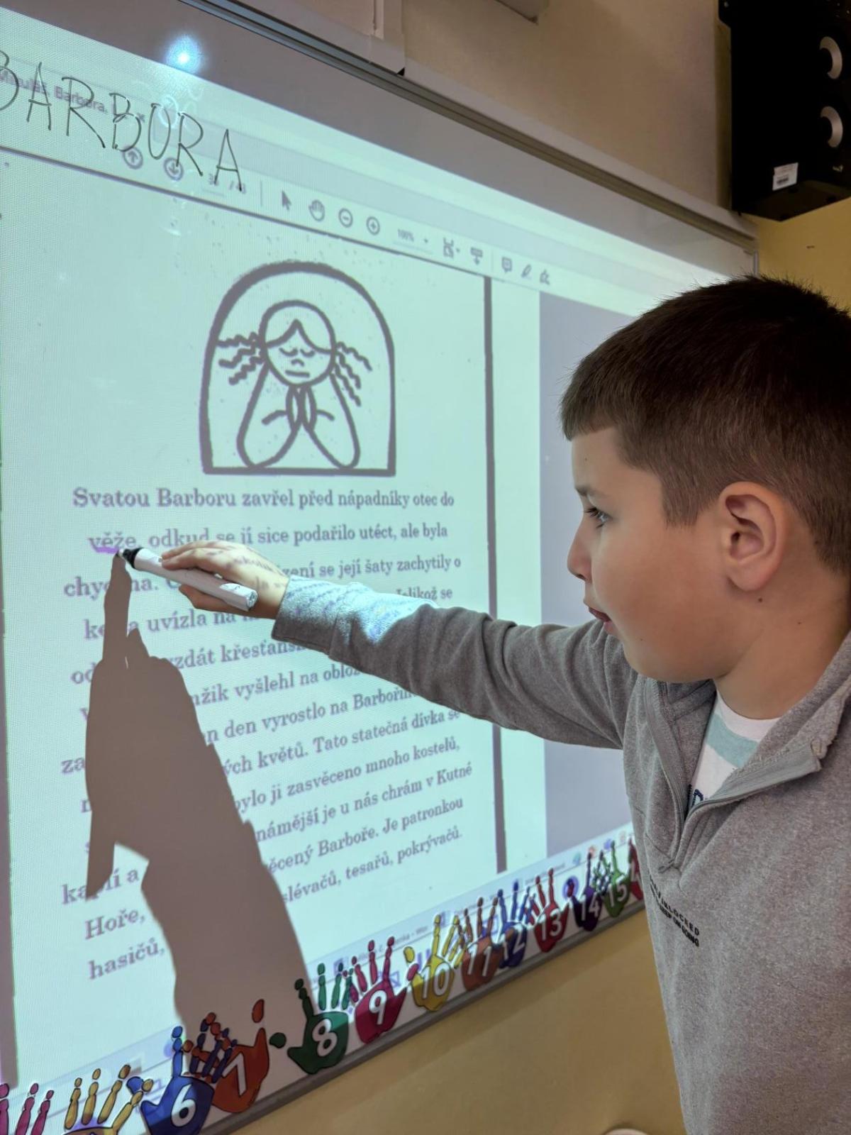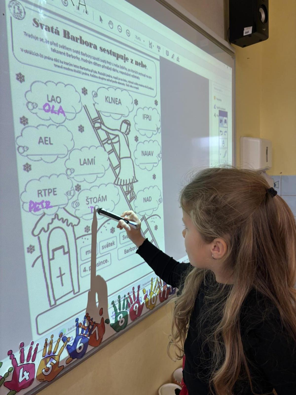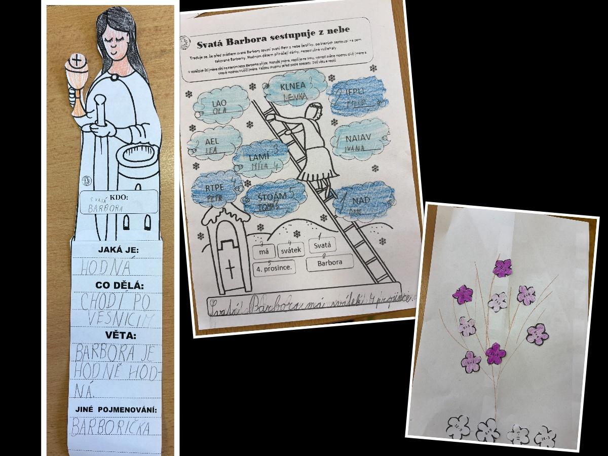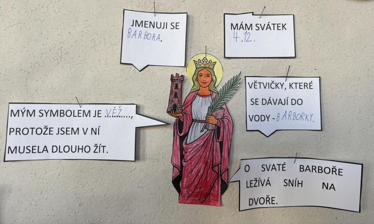 Začátek prosince si žáci zpestřili povídáním o svaté Barboře a zvycích, které se k tomuto svátku pojí. Děti si z 1. třídy zopakovaly, proč se na tento den řežou barborky, co symbolizují a jak lidé v minulosti prožívali adventní čas.