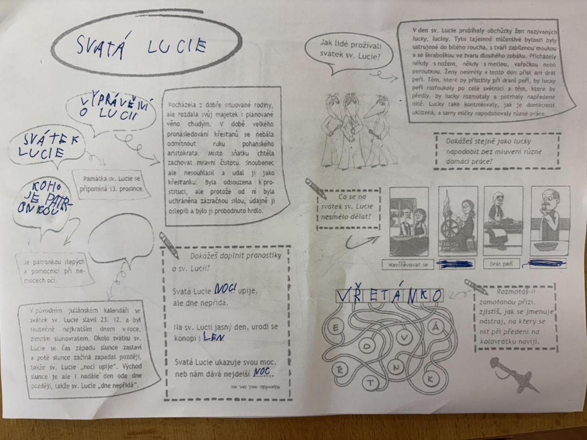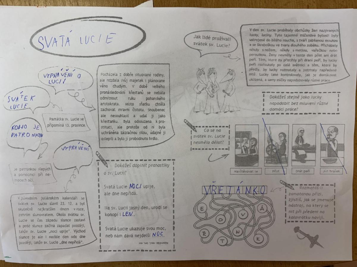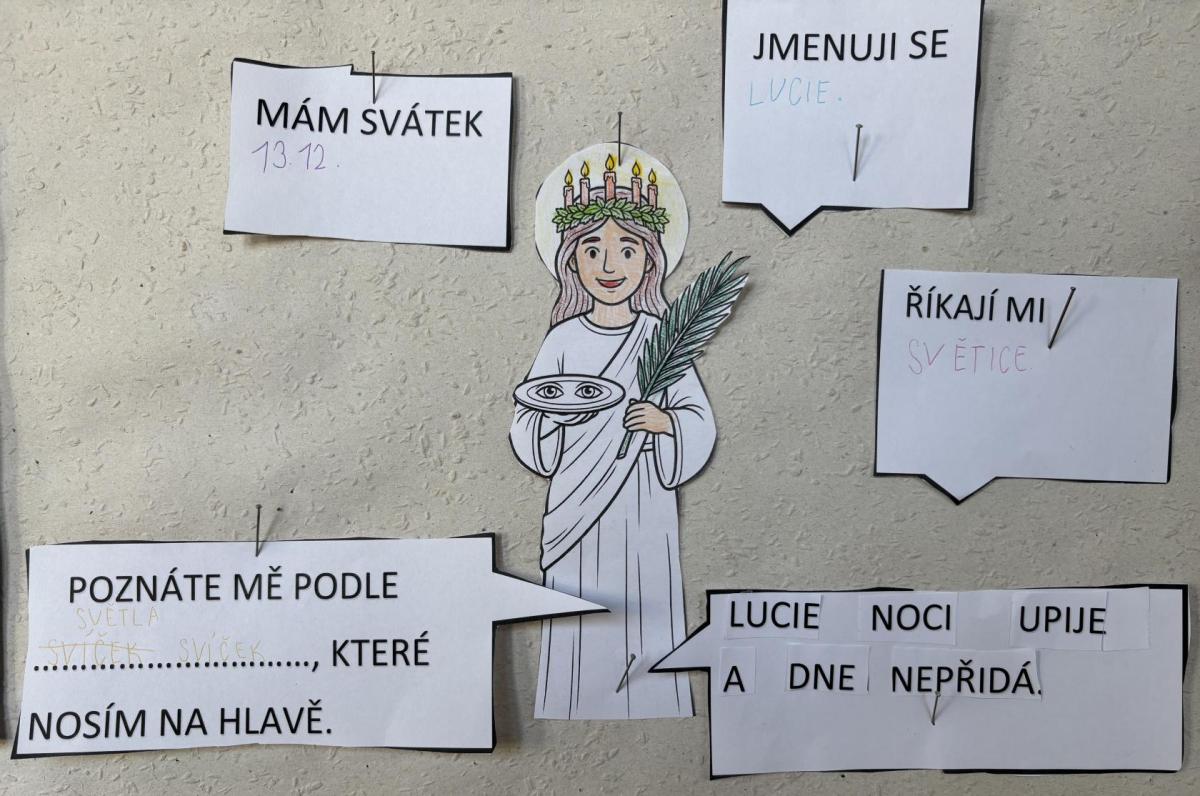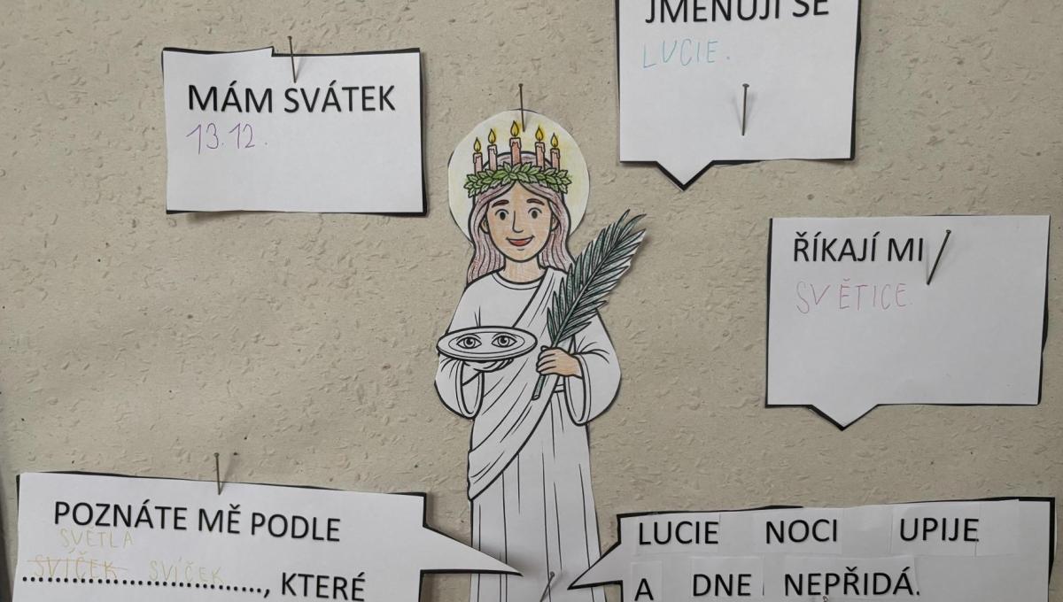 Žáci se seznámili se svátkem sv. Lucie a tradicemi. Povídali jsme si o tom, kdo byla svatá Lucie a proč je tento den spojován se světlem a blížícími se Vánocemi. Hravými aktivitami si děti upevňovaly učivo, pracovaly s textem a tvořily. Výuka probíhala v klidné adventní atmosféře a pomohla žákům lépe porozumět významu tohoto tradičního svátku.