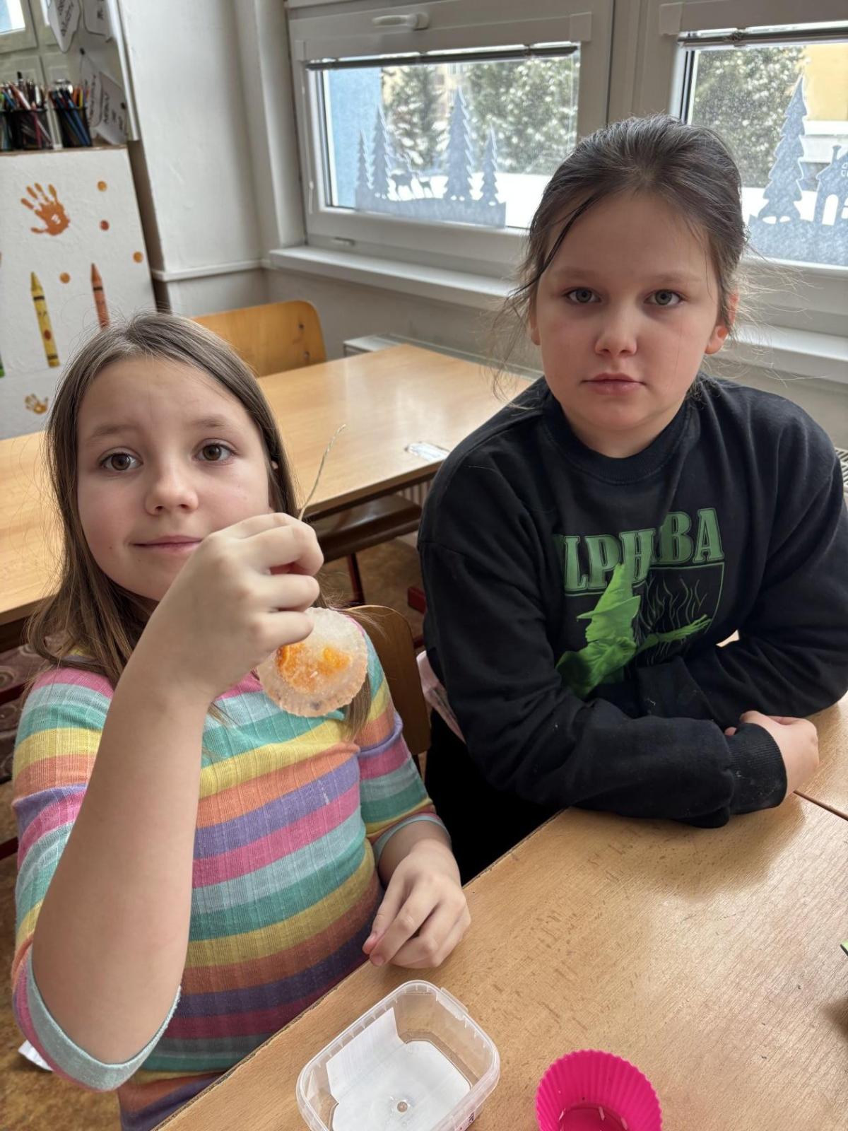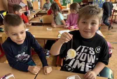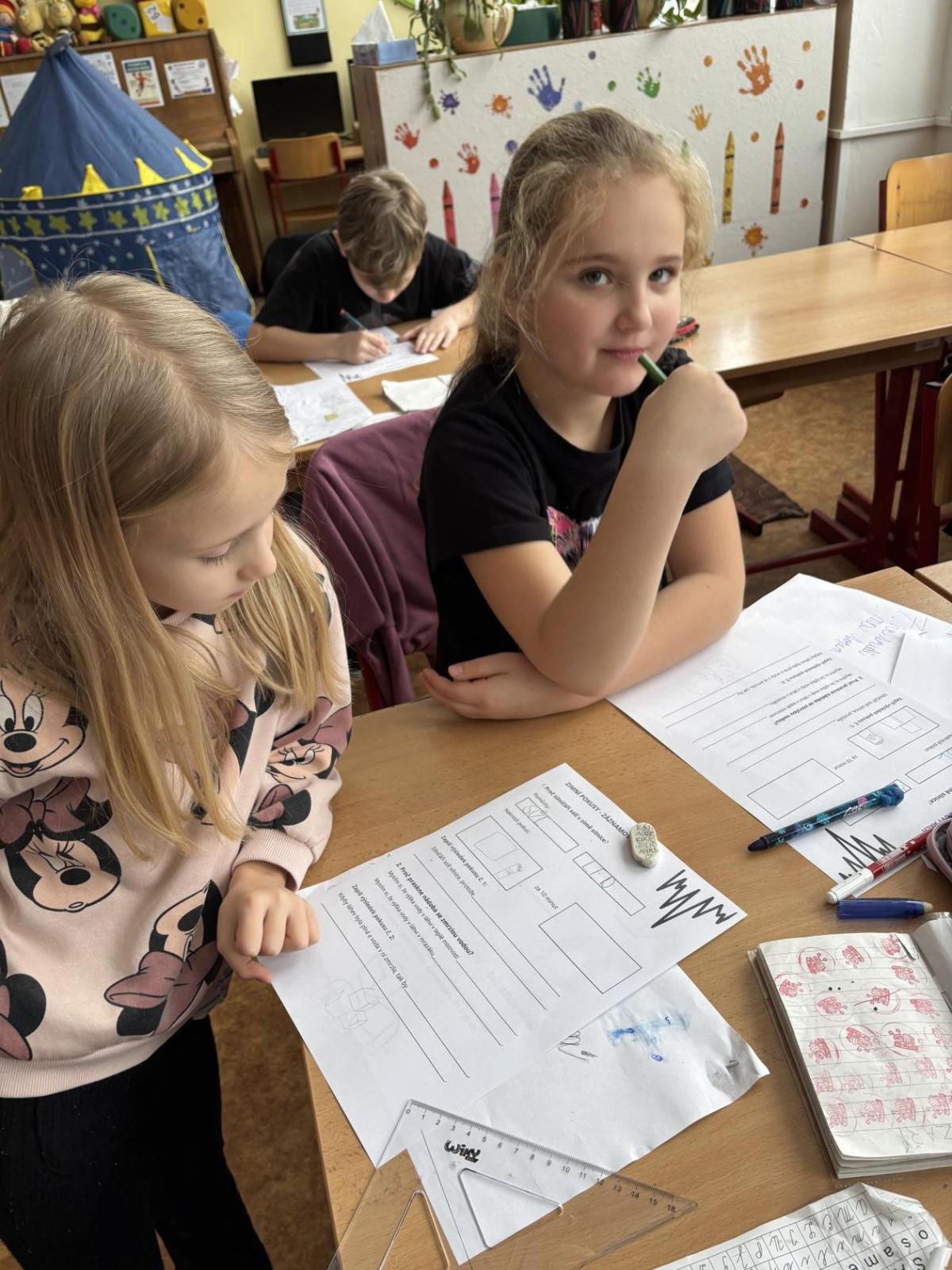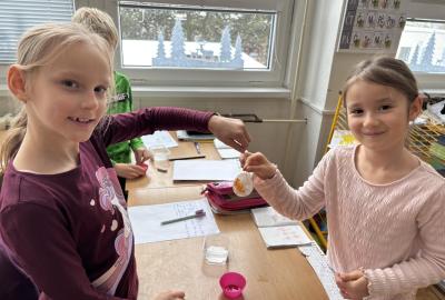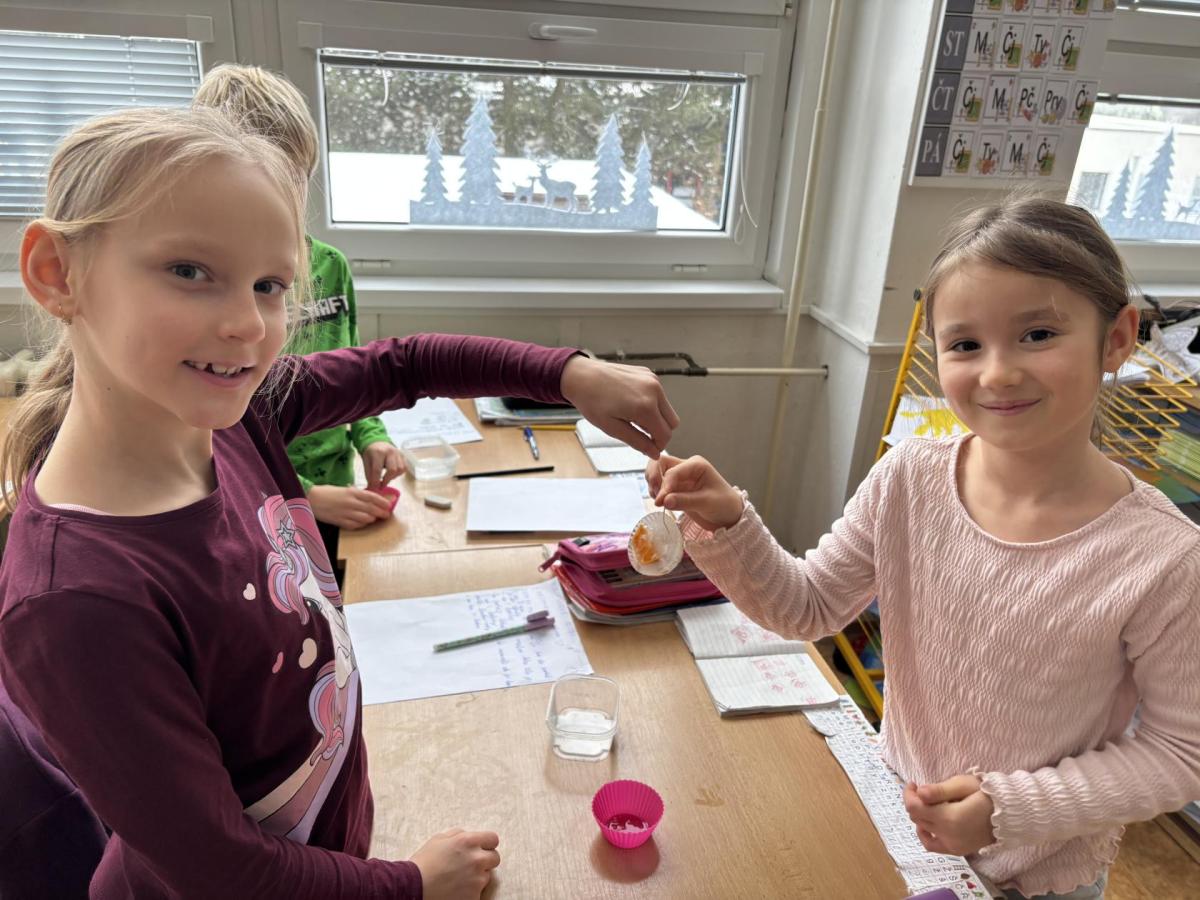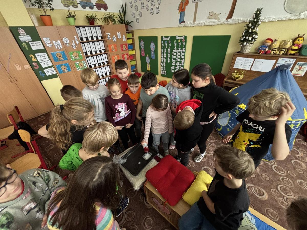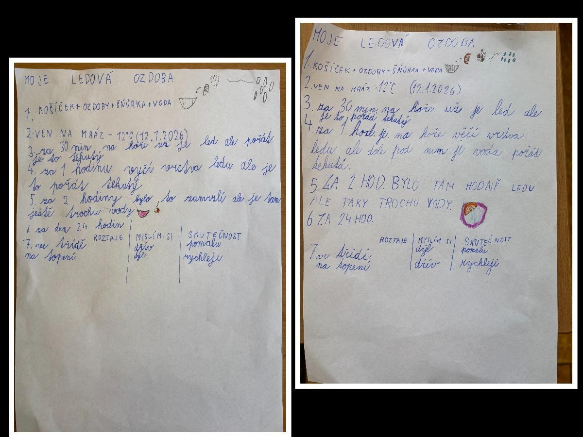 Děti se seznamovaly s vlastnostmi a formami vody v zimním období, pozorovaly její výskyt a změny skupenství. Společně si vyrobily ledovou ozdobu a následně sledovaly, co se s ní děje venku, v místnosti a na topení, výsledky porovnávaly. Zjišťovali jsme také, proč silničáři solí silnice, zda praskne nádoba se zamrzlou vodou a kde roztaje led dříve - zda v misce nebo v dlani. Své pozorování si žáci zaznamenávali do jednoduchých formulářů a na závěr si každý vytvořil vlastní záznam. Aktivity probíhaly hravou a badatelskou formou.