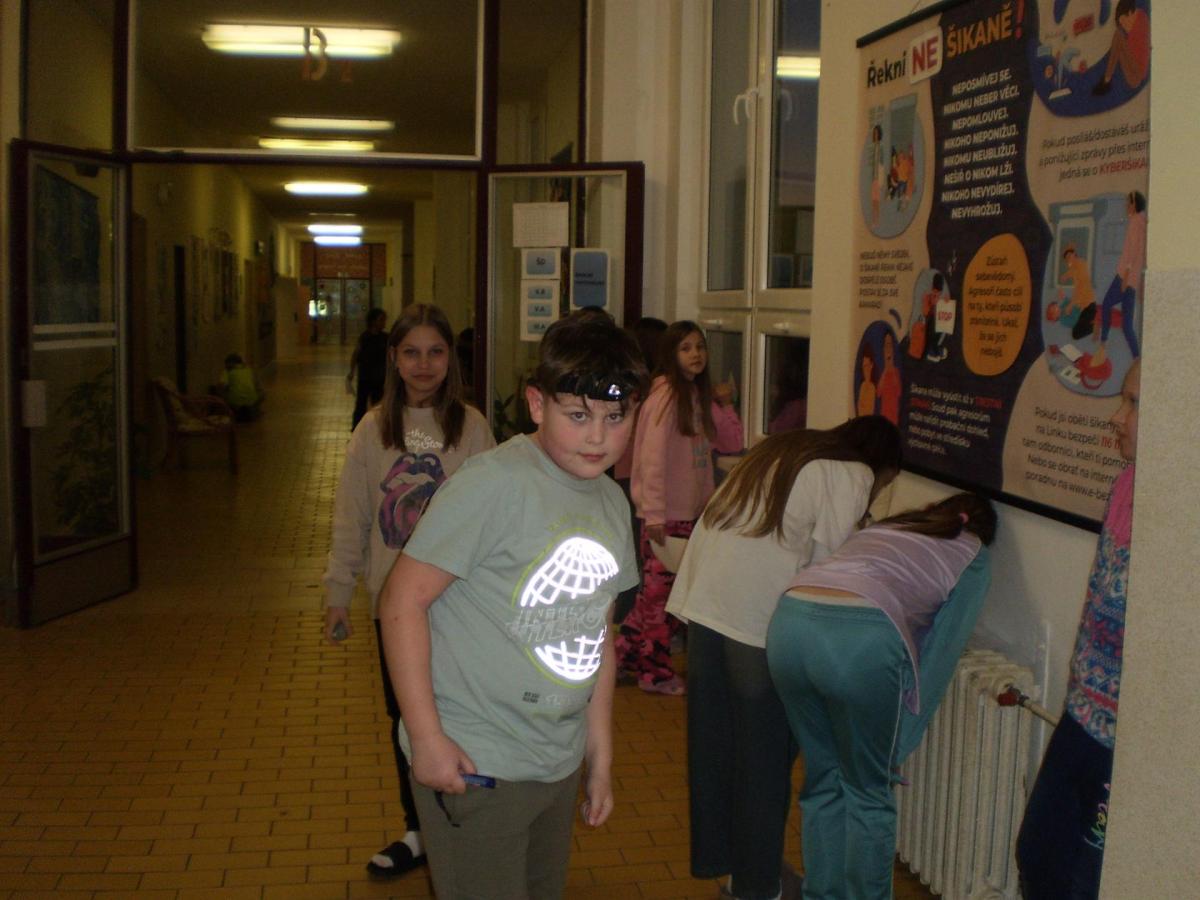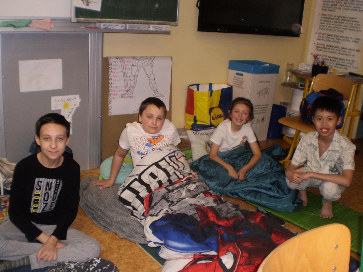 Žáci prožili příjemný večer plný her, překvapení, prostě večer plné zábavy. Připomněli jsme si osobnost, tj. Karla IV., která slaví 710 let. Vydali jsme se do historie, abychom získali ještě více informací o tomto panovníkovi. Hledali jsme klíč, který nás dovedl k cíli ve hře, kdo ukradl poklad na hradě Karla IV. V tělocvičně na žáky čekaly pod rouškou tmy sportovní aktivity, obohacené hudbou a se světly. A nejvíce se však žáci těšili na strašidelnou stezkou. Unavení a plni dojmů ulehli do svých spacáků, nechyběla ještě pohádka na dobrou noc a pod rouškou únavy usínali v pozdních hodinách. Ráno na ně čekala ještě snídaně.