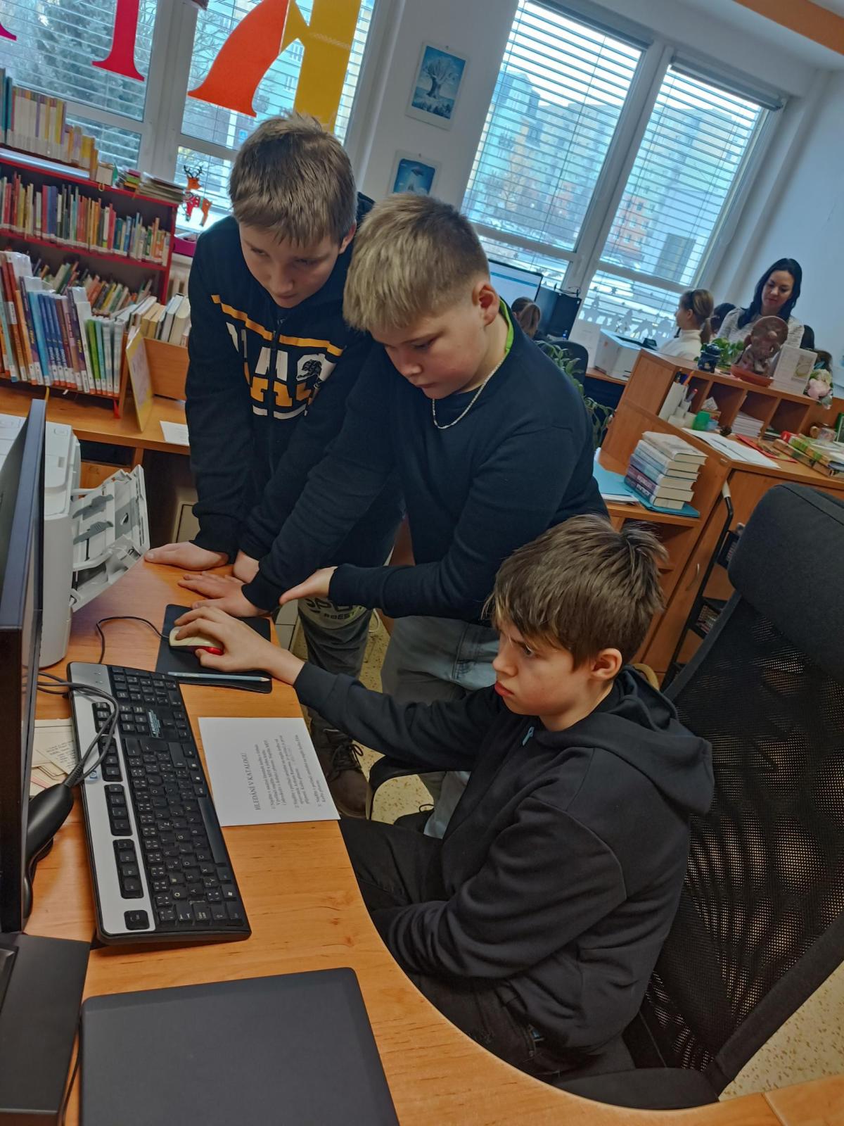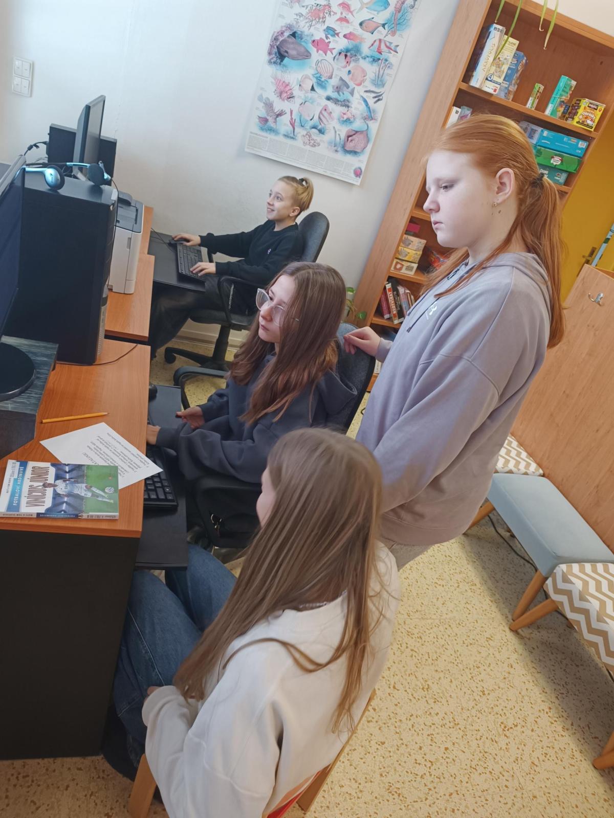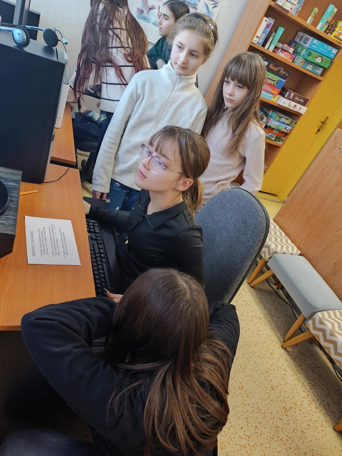 Po úvodním vysvětlení systému třídění knih se žáci učili pracovat s online katalogem na počítačích. Ve skupinách měli za úkol postupně vyhledat tři knihy, ověřit jejich správné umístnění na poličce a donést je paní knihovnici. Všechny skupiny si se zadanými úkoly poradili hladce.
