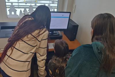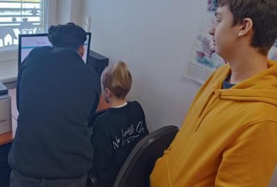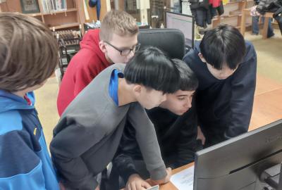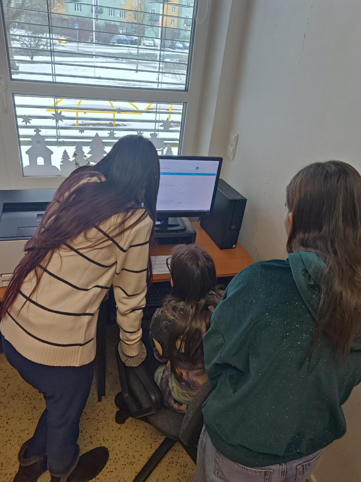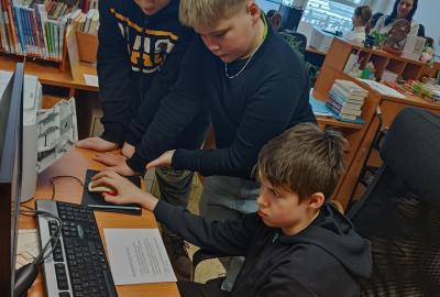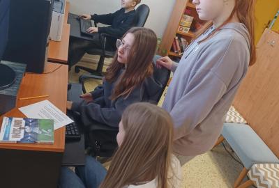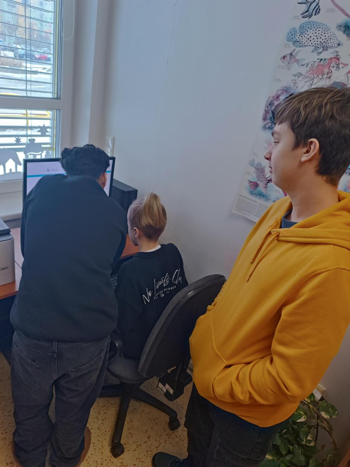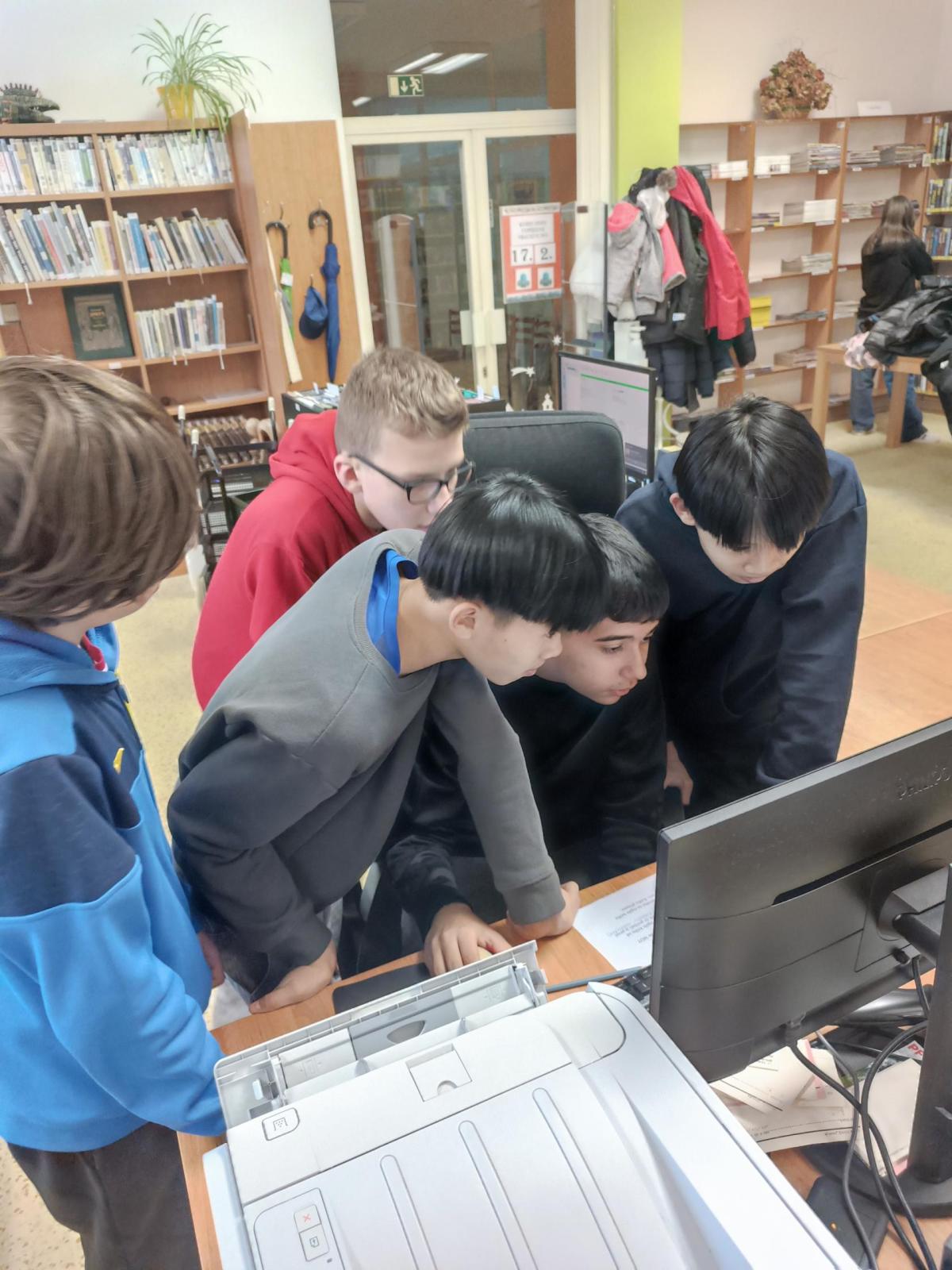 Po úvodním vysvětlení systému třídění knih se žáci učili pracovat s online katalogem na počítačích. Ve skupinách měli za úkol postupně vyhledat tři knihy, ověřit jejich správné umístnění na poličce a donést je paní knihovnici. Všechny skupiny si se zadanými úkoly poradili hladce.